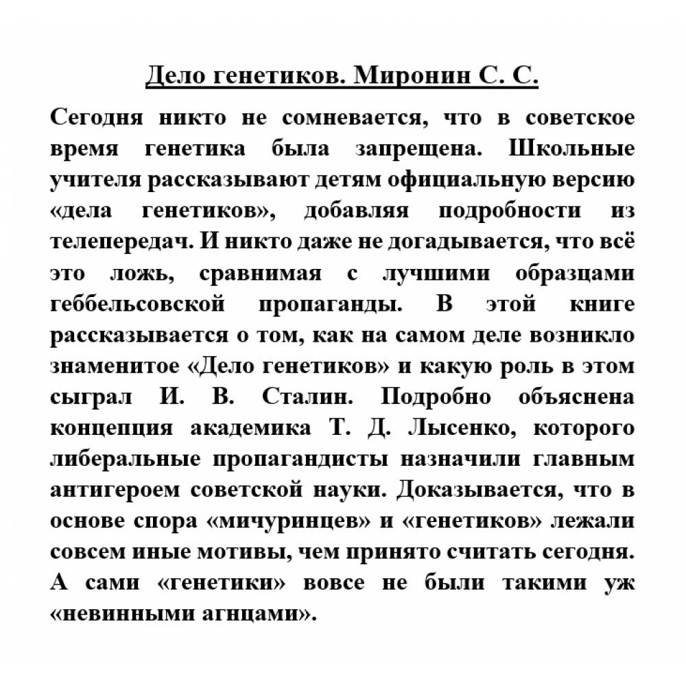 Сегодня никто не сомневается, что в советское время генетика была запрещена. Школьные учителя рассказывают детям официальную версию "дела генетиков", добавляя подробности из телепередач. И никто даже не догадывается, что всё это ложь, сравнимая с лучшими образцами геббельсовской пропаганды. В этой книге рассказывается о том, как на самом деле возникло знаменитое "дело генетиков" и какую роль в этом сыграл И.В. Сталин. Подробно объяснена концепция академика Т.Д. Лысенко, которого либеральные пропагандисты назначили главным антигероем советской науки. Доказывается, что в основе спора "мичуринцев" и "генетиков" лежали совсем иные мотивы, чем принято считать сегодня. А сами "генетики" вовсе не были такими уж "невинными агнцами"