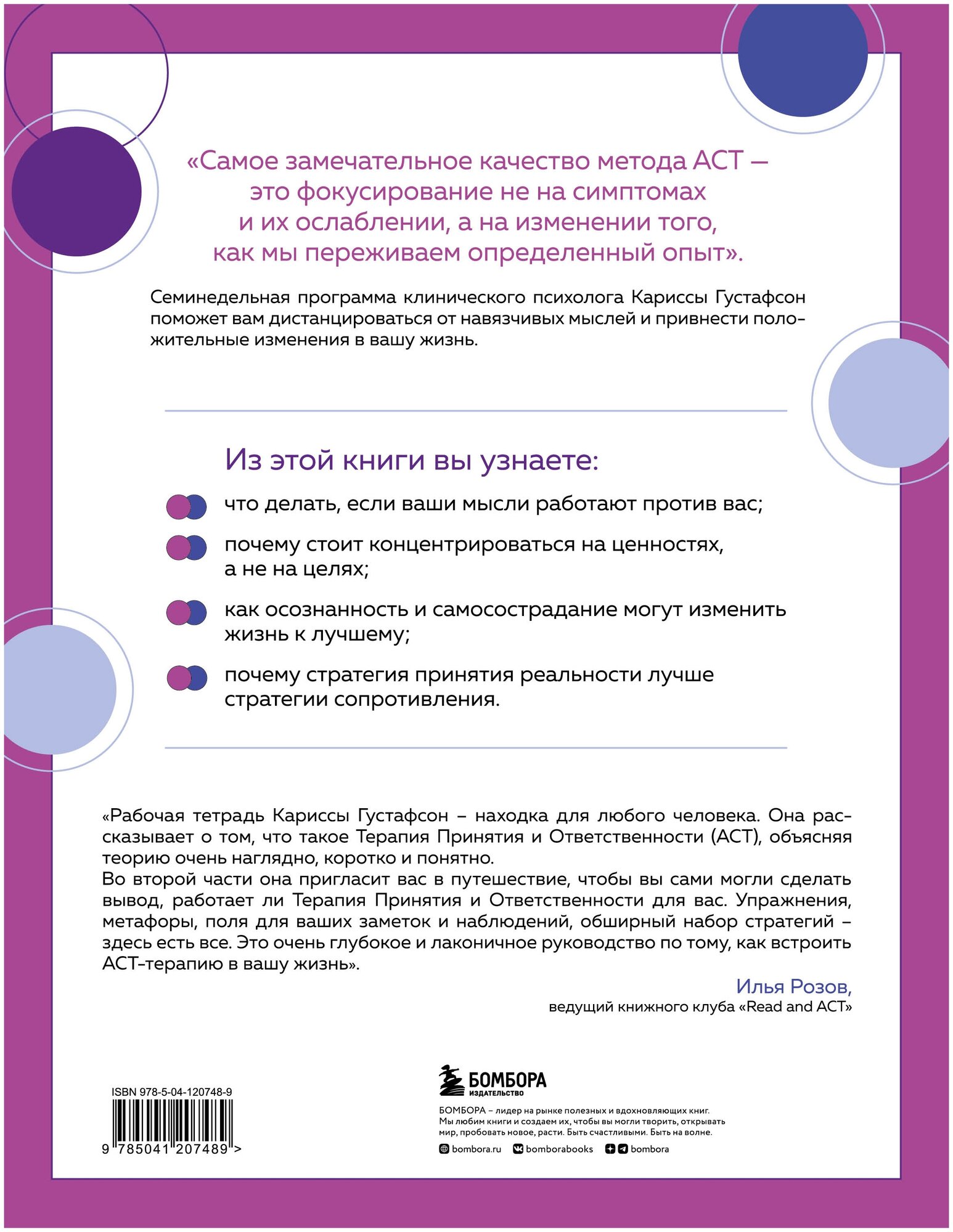 Клинический психолог Карисса Густафсон разработала 7-недельную программу, основанную на Терапии Принятия и Ответственности (АСТ). В этой рабочей тетради собраны теория, объясняющая концепцию АСТ-терапии, и множество практик, которые помогут вам привнести положительные изменения в вашу жизнь.