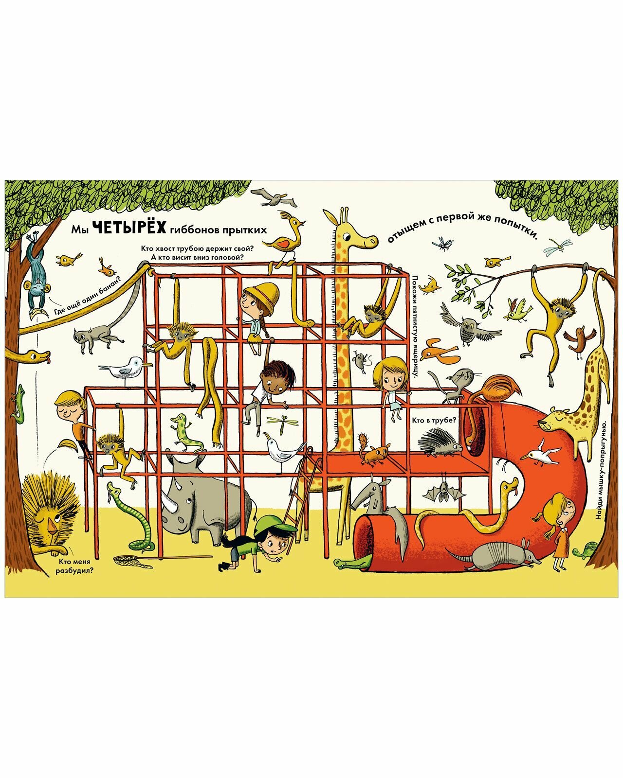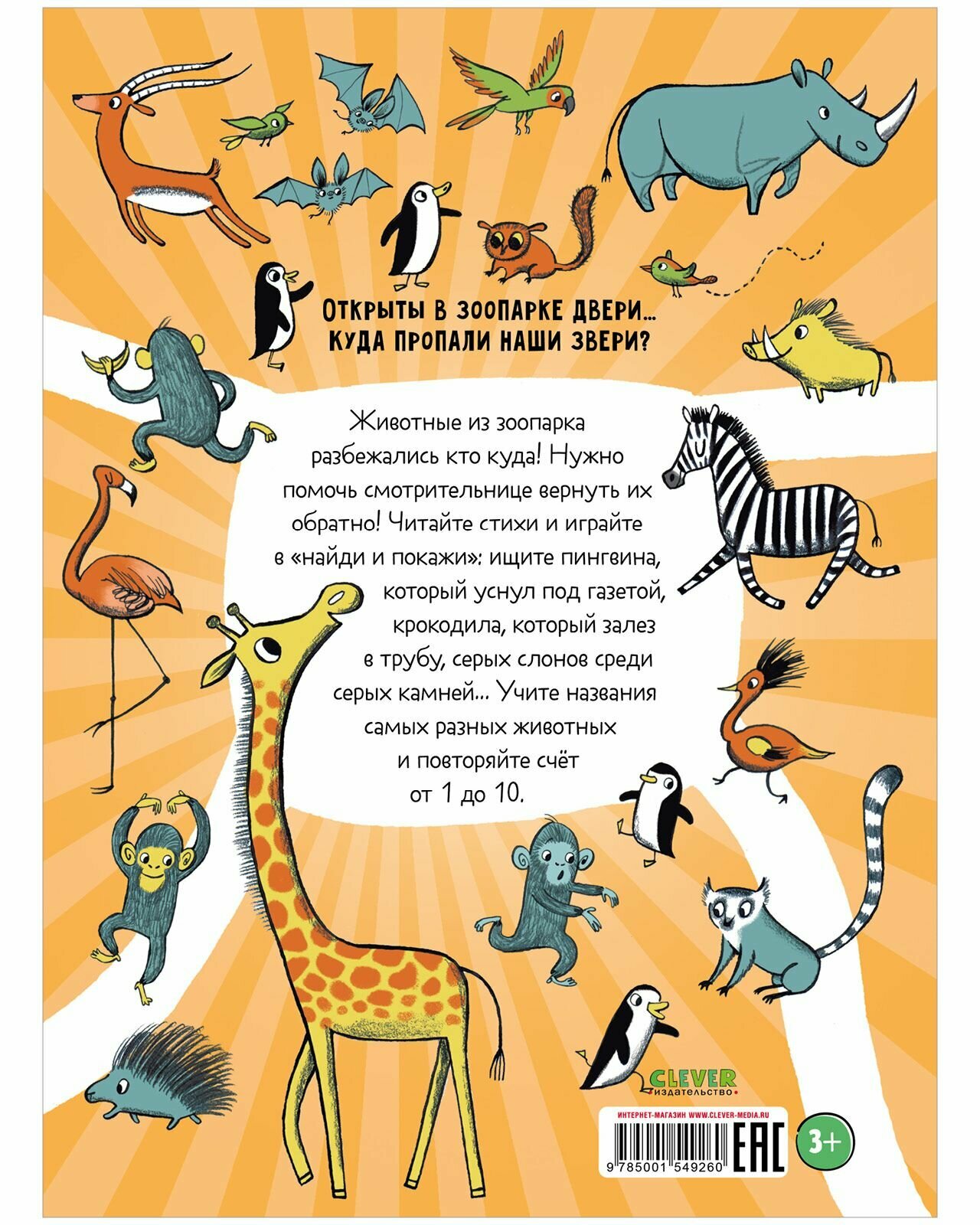 В ярком виммельбухе «Найди и покажи. Куда сбежали животные?» вас ждут веселые стихи и много предметов для поиска на каждом развороте. Читайте и играйте, знакомьтесь с обитателями зоопарка и повторяйте счет до 10.