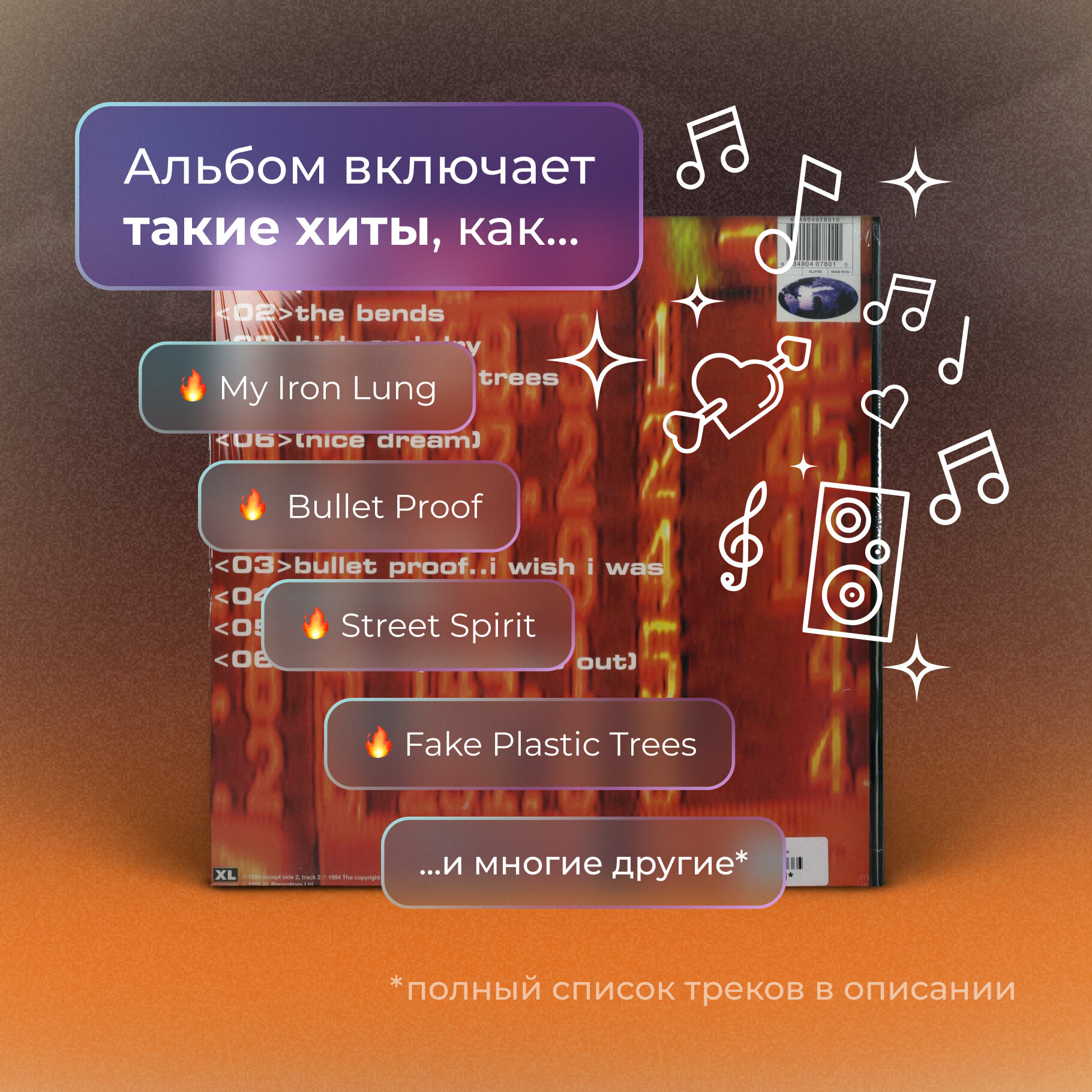 "The Bends" - второй студийный альбом группы Radiohead, вышедший в свет в начале 1995 года. Стал трижды платиновым в Британии. Несмотря на достаточно четкую брит-поп направленность многих композиций, "The Bends" впервые показывает стремление группы к поиску и мультижанровости: группа экспериментирует с клавишными, с музыкальными размером и типом аранжировок.Британская рок-группа Radiohead была основана в 1985 году и на сегодняшний момент является одной из самых известных рок-команд в мире. Стиль Radiohead традиционно определяют как альтернативный рок, хотя на разных этапах звучание варьировалось от брит-попа до арт-рока и электронной музыки. По данным на май 2011 года, альбомы Radiohead были проданы в количестве примерно 30 миллионов копий. Практически каждый альбом получал платиновые и золотые статусы по всему миру. Три пластинки группы получили Грэмми в номинации "лучший альтернативный альбом", также в активе имеется несколько наград NME Awards, MTV Video Music Awards и Q Awards.Список композиций1. A1. Planet Telex2. A2. The Bends3. A3. High and Dry4. A4. Fake Plastic Trees5. A5. Bones6. A6. (Nice Dream)7. B1. Just8. B2. My Iron Lung9. B3. Bullet Proof . I Wish I Was10. B4. Black Star11. B5. Sulk12. B6. Street Spirit (Fade Out)