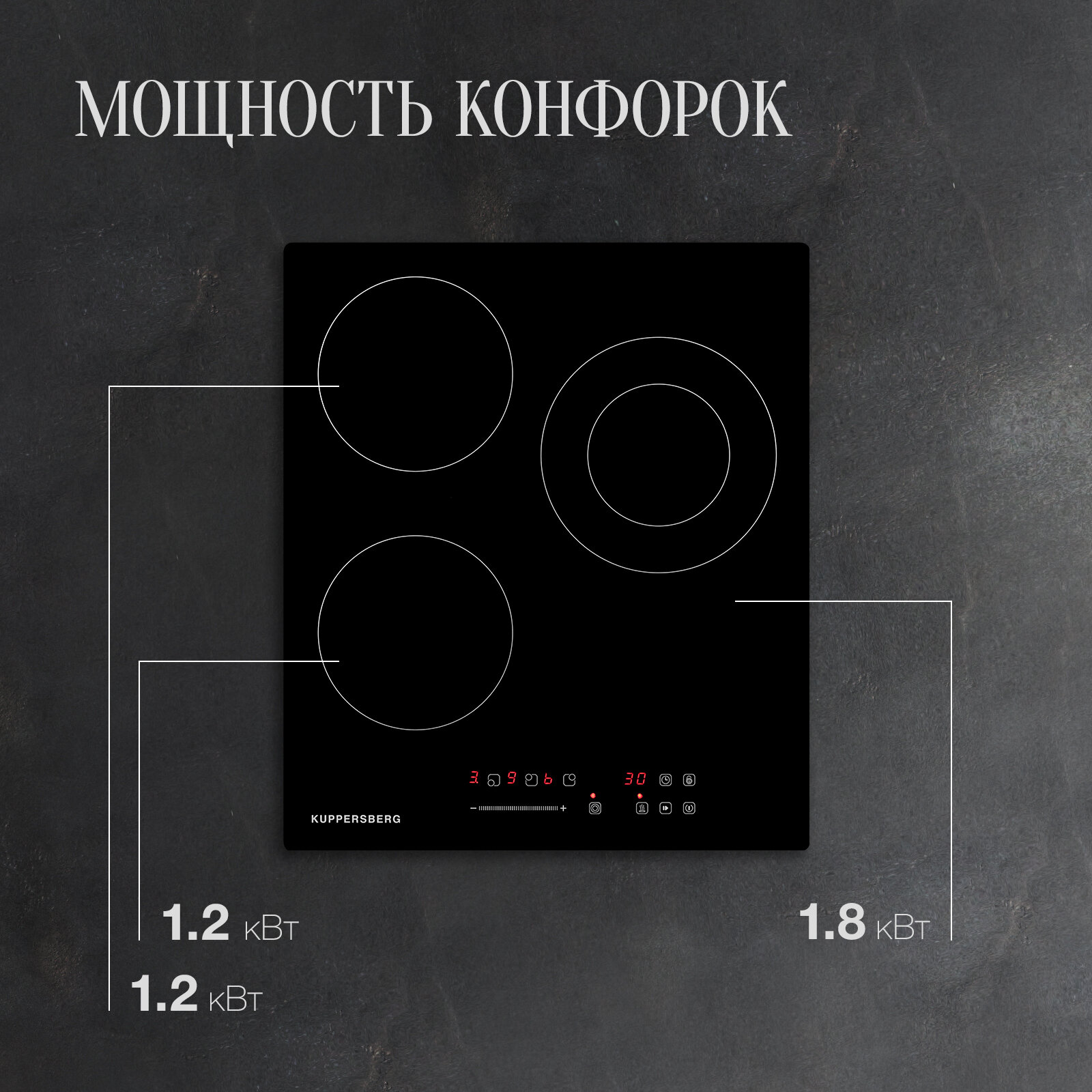 Электрическая варочная поверхность Kuppersberg ECS 403 с тремя независимыми конфорками обладает рабочей панелью из стеклокерамики – материала, на очистку которого даже от въевшихся загрязнений вы потратите минимум времени. При помощи сенсорной панели управления вы сможете в считанные секунды установить 1 из 9 мощностей нагрева. Еще одно достоинство модели Kuppersberg ECS 403 – предусмотренная в ней двухконтурная конфорка, зона нагрева которой изменяется в соответствии с диаметром посуды. Индикаторы остаточного тепла подскажут, какая из конфорок осталась горячей после выключения прибора, что позволит вам разогреть или довести до готовности различные блюда, не расходуя электричество. Встроенный таймер в автоматическом режиме приостановит работу домашней помощницы, как только подойдет к концу заданный вами временной промежуток. Функция блокировки не позволит маленьким детям включить варочную панель или внести коррективы в установленные параметры.