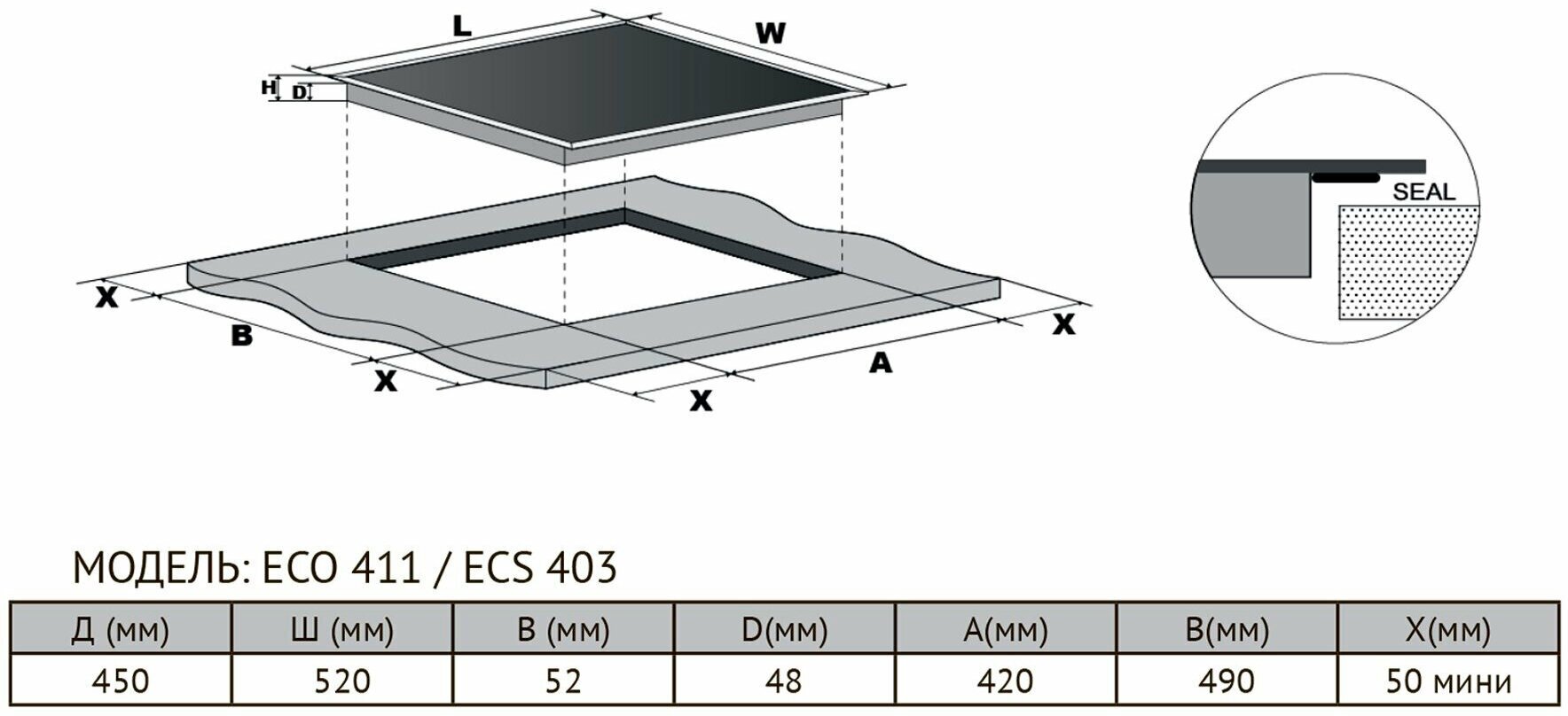 | Размер ниши для встраивания | (ШхГ), мм:420×490 |