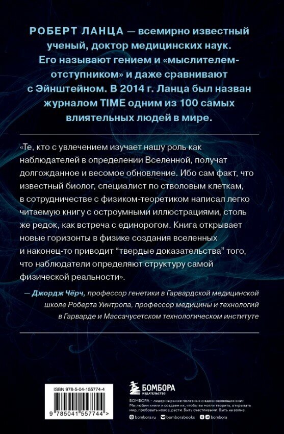 "Те, кто с увлечением изучают нашу роль как наблюдателей в определении Вселенной, получат долгожданное и весомое обновление. Ибо сам факт, что известный биолог, специалист по стволовым клеткам, в сотрудничестве с физиком-теоретиком написал связную, свежую и легко читаемую книгу с остроумными иллюстрациями, - столь же редок, как встреча с единорогом. "Биоцентризм. Великий дизайн" открывает новые горизонты в физике создания вселенных и наконец-то приводит "твердые доказательства" того, что наблюдатели определяют структуру самой физической реальности". - Джордж Черч, профессор генетики в Гарвардской медицинской школе Роберта Уинтропа, профессор медицины и технологий в Гарварде и Массачусетском технологическом институте