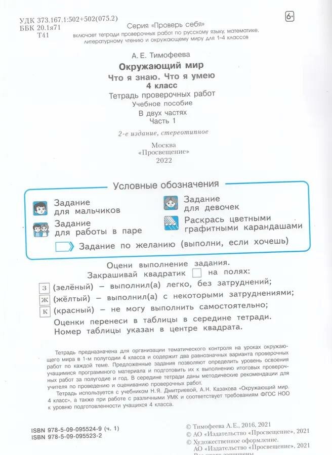 Окружающий мир 4 класс Что я знаю Что я умею Тетрадь проверочных работ в 2 частях Часть 1 (Тимофеева И.); Просвещение, 2021