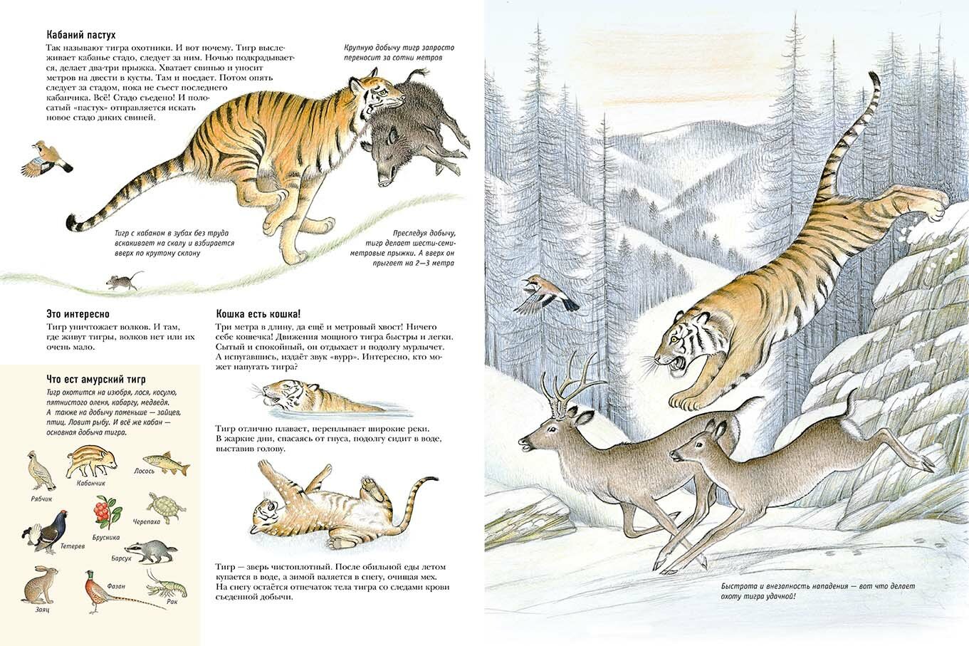 Автор рассказывает, как по следам отличить волка от собаки, рысь от росомахи, зайца-беляка от зайца-русака; как по внешнему виду норы или гнезда узнать, кто здесь обитает; как «прочитать» метки, оставленные на деревьях медведем или тигром и т.д. В книге множество интересных сюжетов: купальни кабанов, доение лосих, медведи-рыболовы, птицы с мешками, барсучье городище, «покатушки» выдр. Особенно хороши «семейные» зарисовки: мамы с детенышами. Даже если картинки-рассказы не идиллические (рысь поймала зайца, тигр схватил кабанчика, филин нацелил когти на енота), они не выглядят трагическими и не доведут маленького читателя до слез: ребенок поймет, что обитатели леса живут своей непростой жизнью и действуют в соответствии со своими врожденными инстинктами.