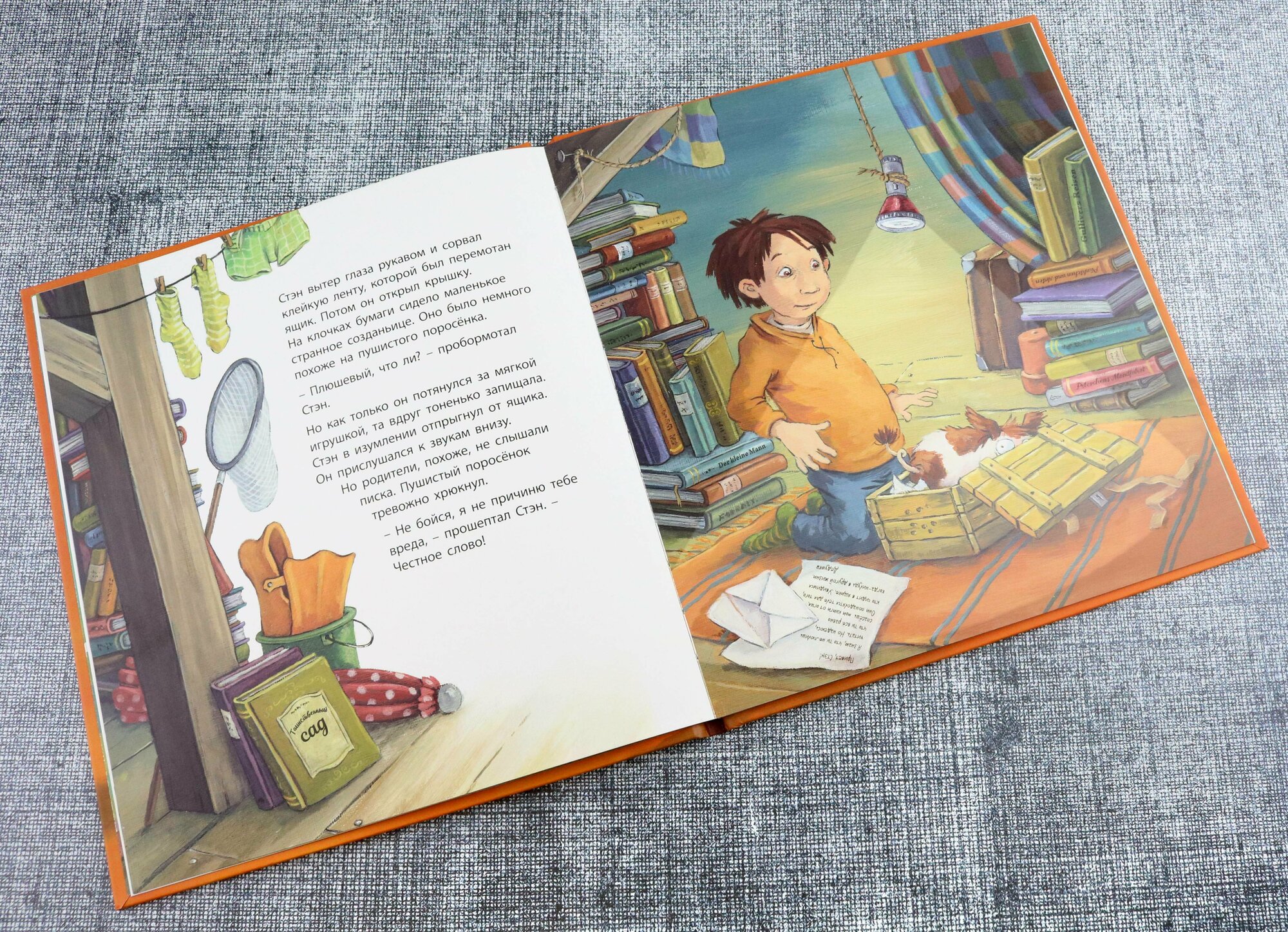 Перед нами красиво оформленная книга о том, какие увлекательные миры таятся под порой невзрачными корешками книг. В книге совсем немного текста, но всё же лучше не оставлять её на самостоятельное чтение, а смаковать вместе в ребёнком. К тому же, история появления необычного зверька у главного героя весьма сентиментальна.