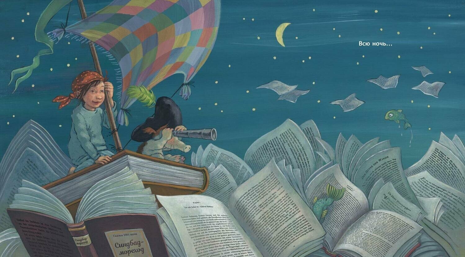 По сути это книжка-картинка – прекрасные иллюстрации на весь разворот и блоки текста (очень крупным шрифтом) на часть страницы. Для меня это отличный вариант для начинающих читателей, когда важно небольшими историями познакомить ребенка с удивительным миром скрытым под обложками книг. А тут еще и прямым текстом это написано. Поэтому и порекомендую ее дошкольникам, начинающим самостоятельно читать. Хотя деткам помладше эта история, прочитанная родителями, тоже понравится.