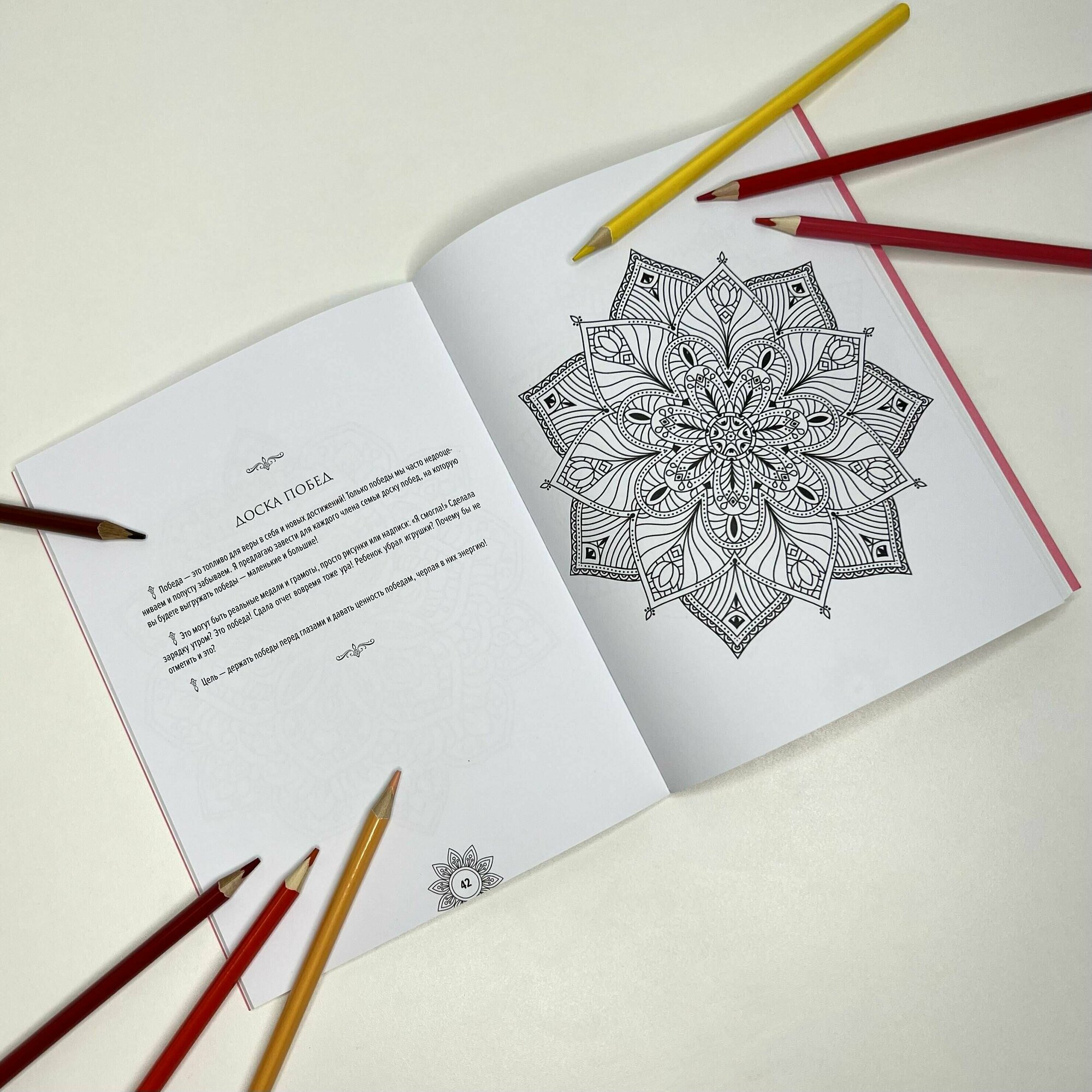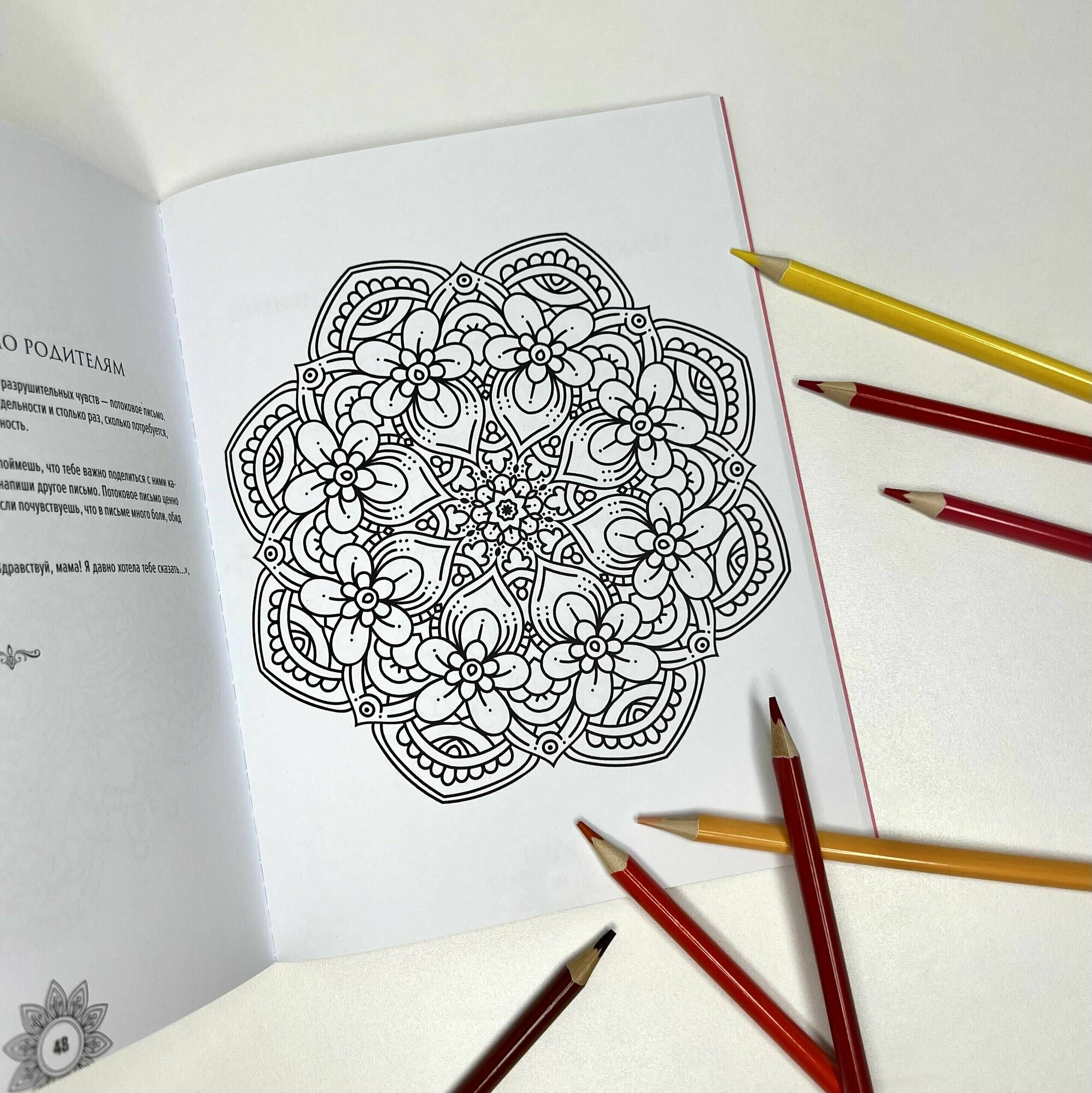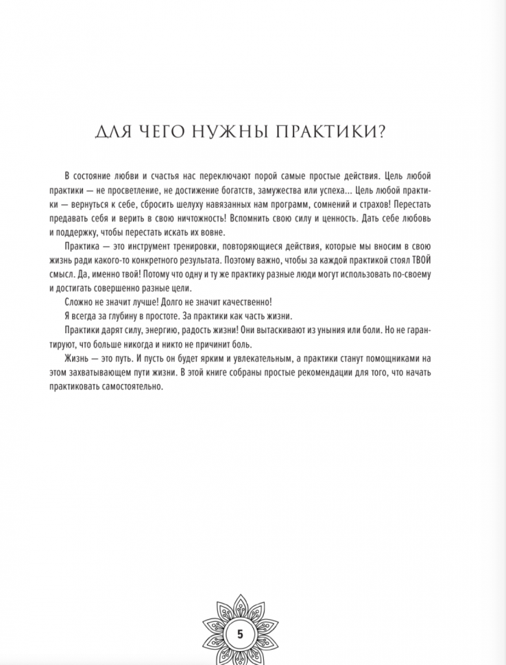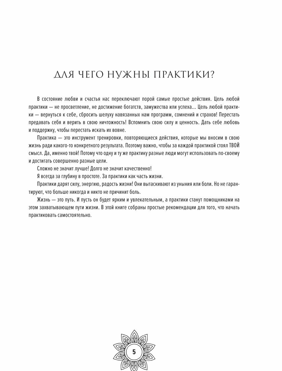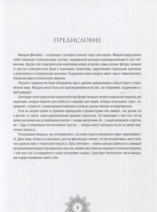 Книгу заказывала исключительно ради мандал. Что там на другой стороне страницы мне было не особо интересно, главное, что иллюстрации односторонние, можно раскрашивать чем угодно. Мандалы не разочаровали, понравились всё до одной. Но и некоторые практики неожиданно заинтересовали, захотелось попробовать. Печать хорошая, чёткая, не пиксельная. А вот склейка мне что-то не нравится.