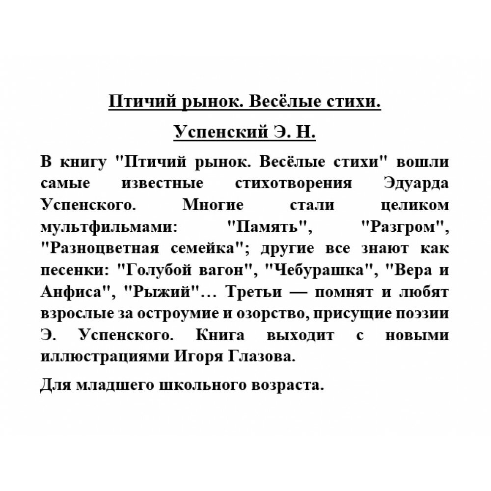 На сегодняшний день товар «Книга: Птичий рынок. Весёлые стихи (Эдуард Успенский); Издательство АСТ, 2022» можно купить с кешбеком в 5 магазинах: book24, ЛитРес, Буквоед, Читай-город, Яндекс.Маркет