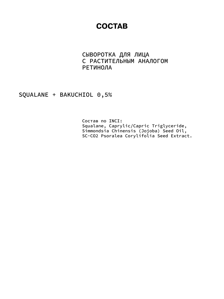 Состав: squalane, caprylic/capric triglyceride, simmondsia chinensis (jojoba) seed oil, sc-co2 psoralea corylifolia seed extract.
