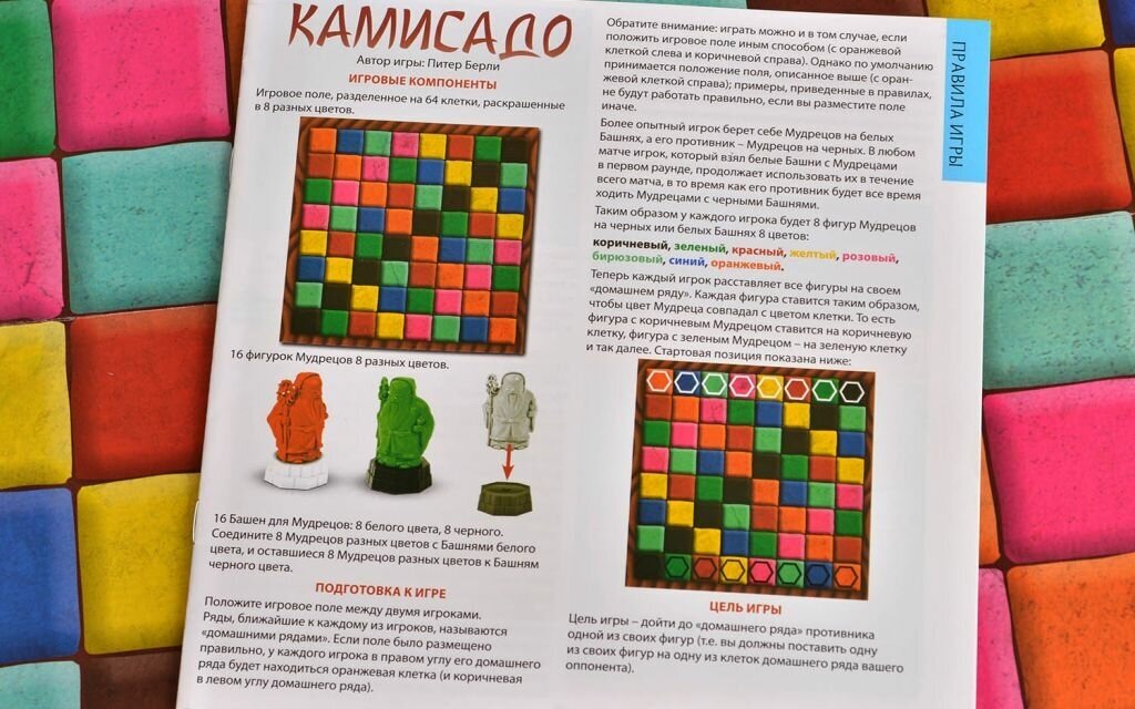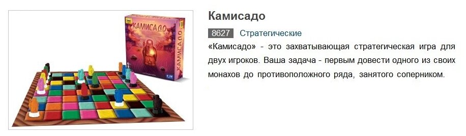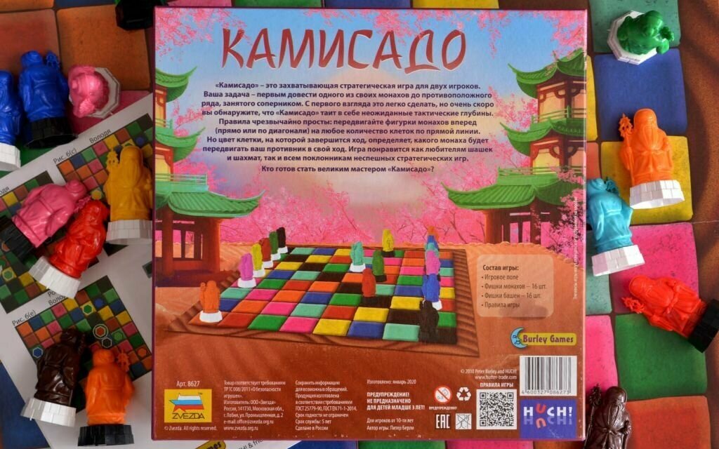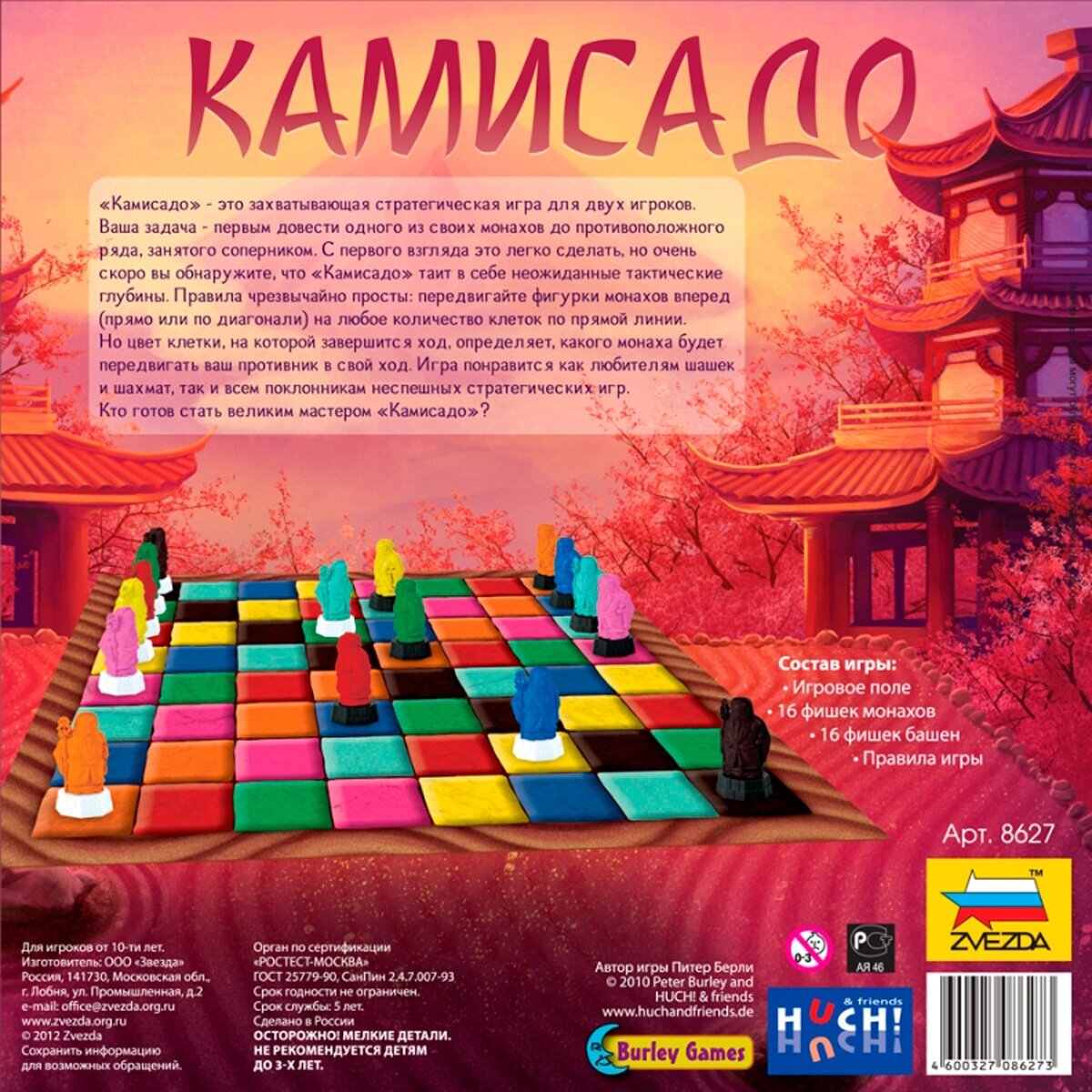 «Камисадо» - это захватывающая стратегическая игра для двух игроков. Ваша задача - первым довести одного из своих монахов до противоположного ряда, занятого соперником. С первого взгляда это легко сделать, но очень скоро вы обнаружите, что «Камисадо» таит в себе неожиданные тактические глубины. Правила чрезвычайно просты: передвигайте фигурки монахов вперед (прямо или по диагонали) на любое количество клеток по прямой линии. Но цвет клетки, на которой завершится ход, определяет, какого монаха будет передвигать ваш противник в свой ход. Игра понравится как любителям шашек и шахмат, так и всем поклонникам неспешных стратегических игр. Кто готов стать великим мастером «Камисадо»?