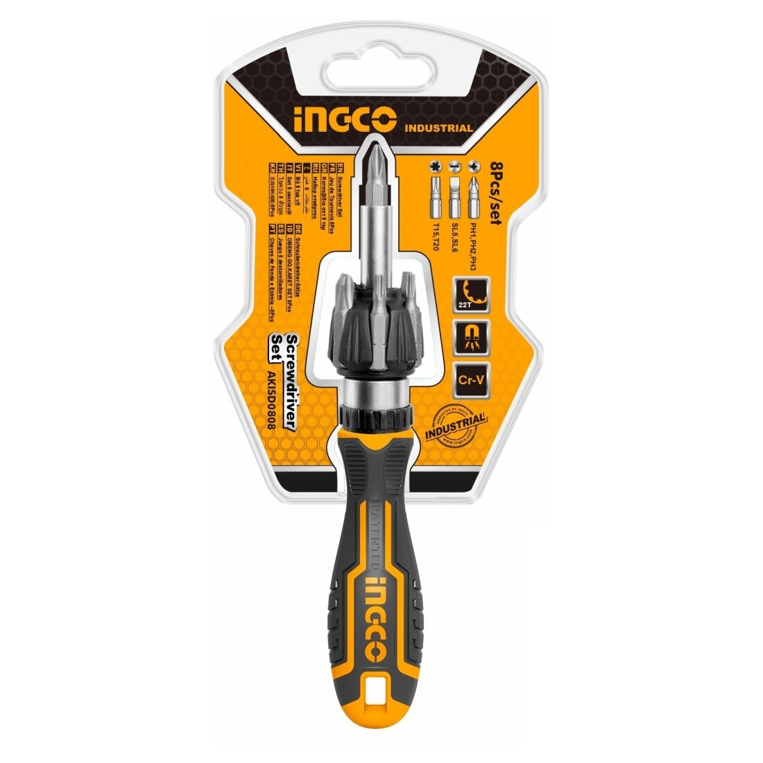 Трещоточная отвёртка с битами INGCO 8 шт INDUSTRIAL AKISD0808 используется для завинчивания и отвинчивания крепежа с различным профилем. Для наиболее эффективной работы инструмент оснащен специальным трещоточным механизмом 22 зубъями и реверсивным механизмом для удобства выполнения работ. Эргономичная двухкомпонентная противоскользящая рукоятка с упором по палец.
