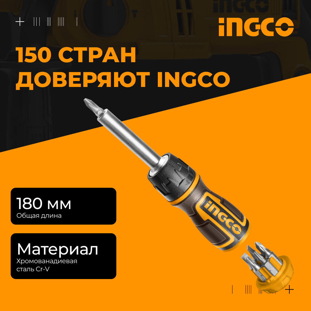 отвертка реверсивная INGCO 190мм с битами 8шт и трещеткой (AKISD0808)