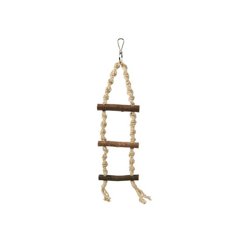 Веревочная лесенка из трех ступенек для волнистых попугаев, канареек и похожих по размеру птиц. Подвешивается в любое место клетки и фиксируется небольшим металлическим карабином.Использованы натуральные безопасные материалы - сизалевая веревка и натуральное дерево, из которого выполнены ступеньки.
