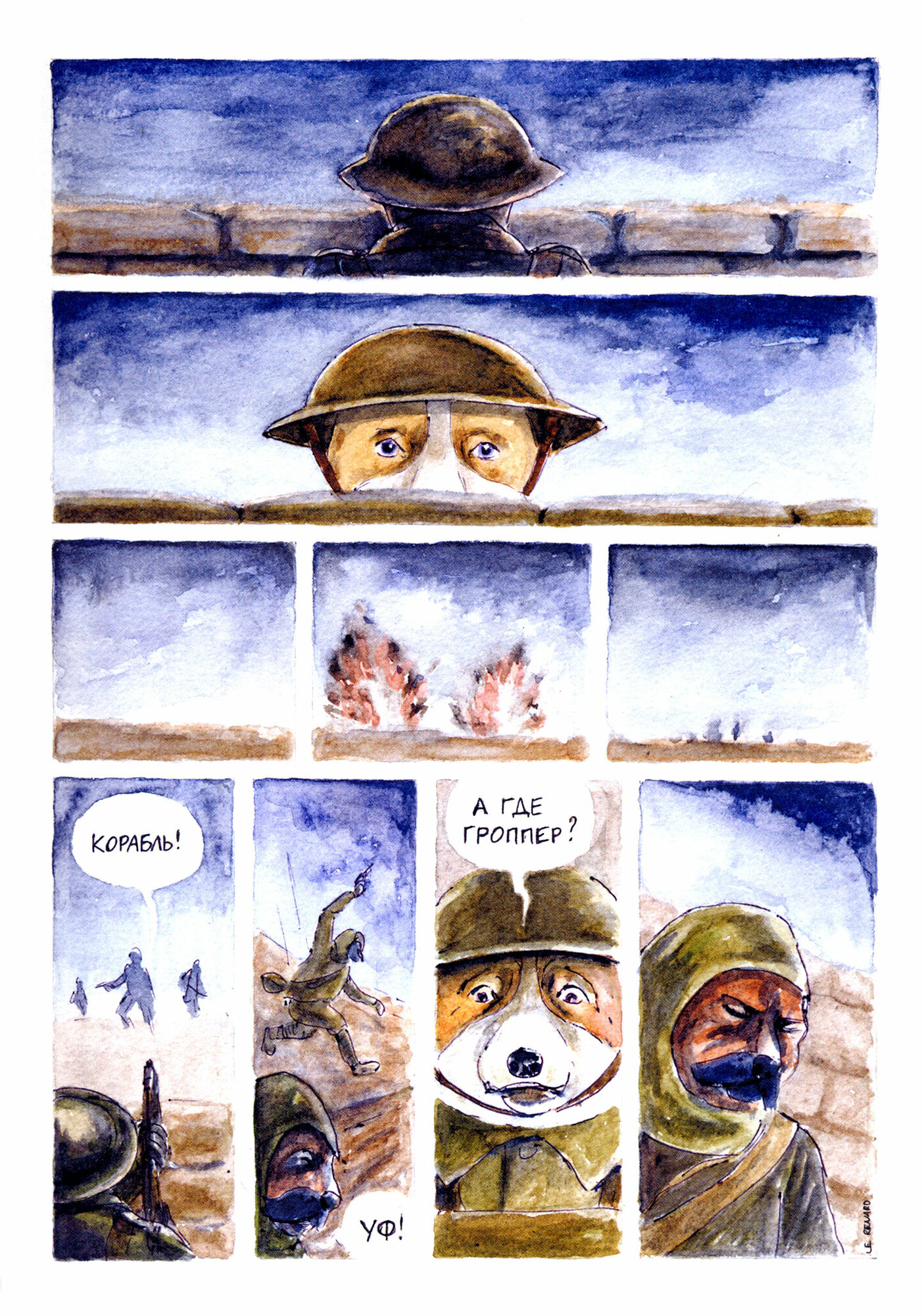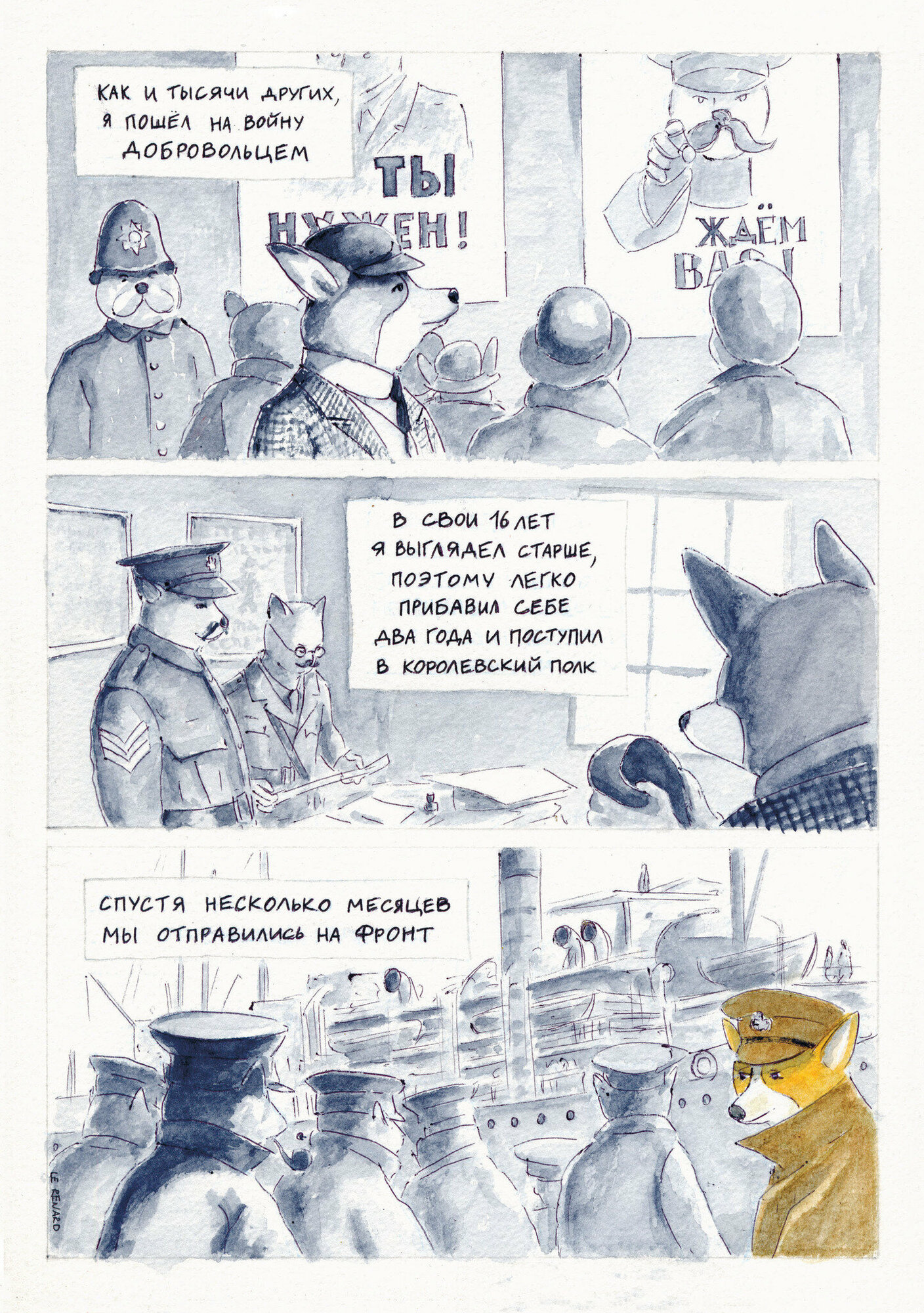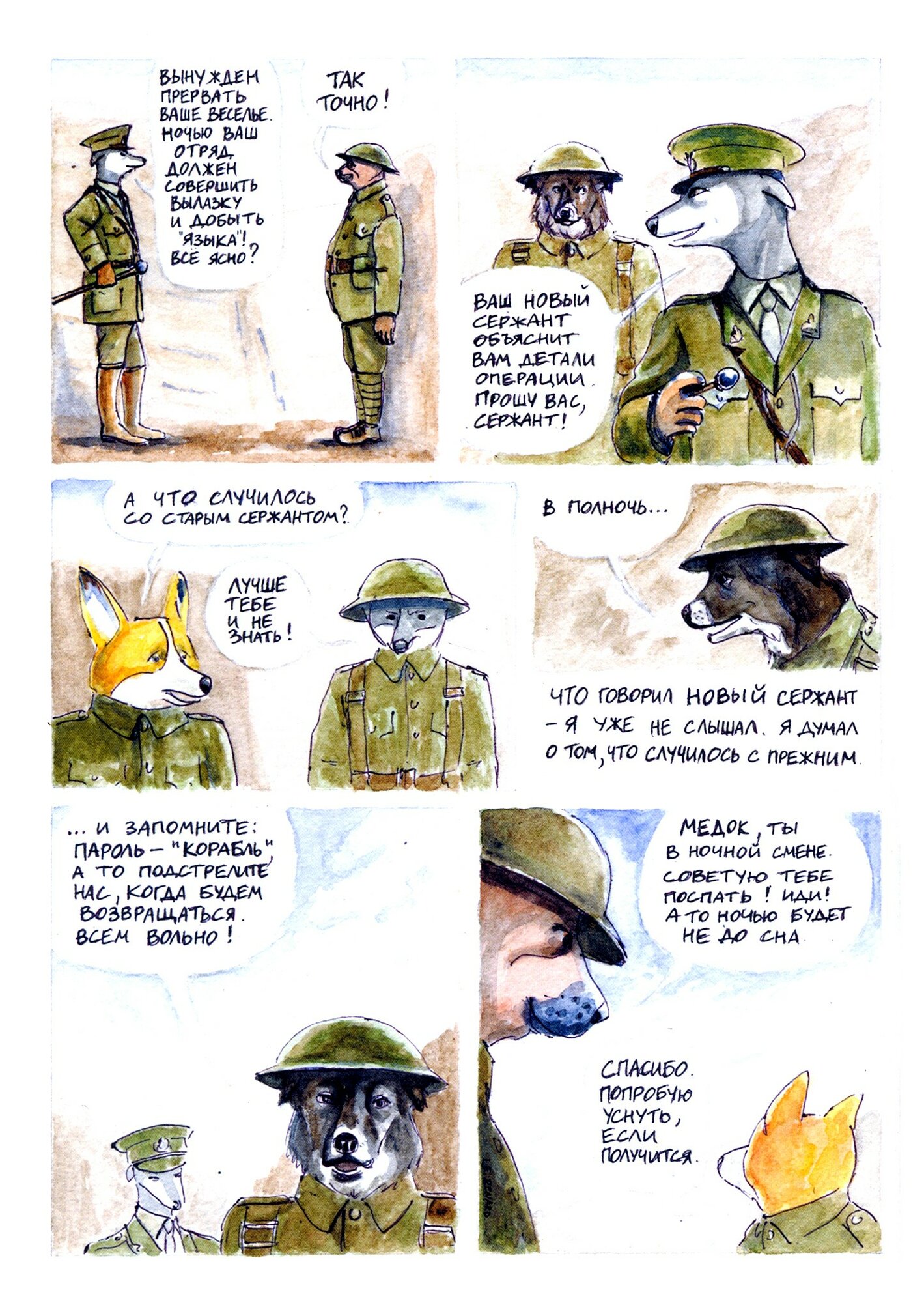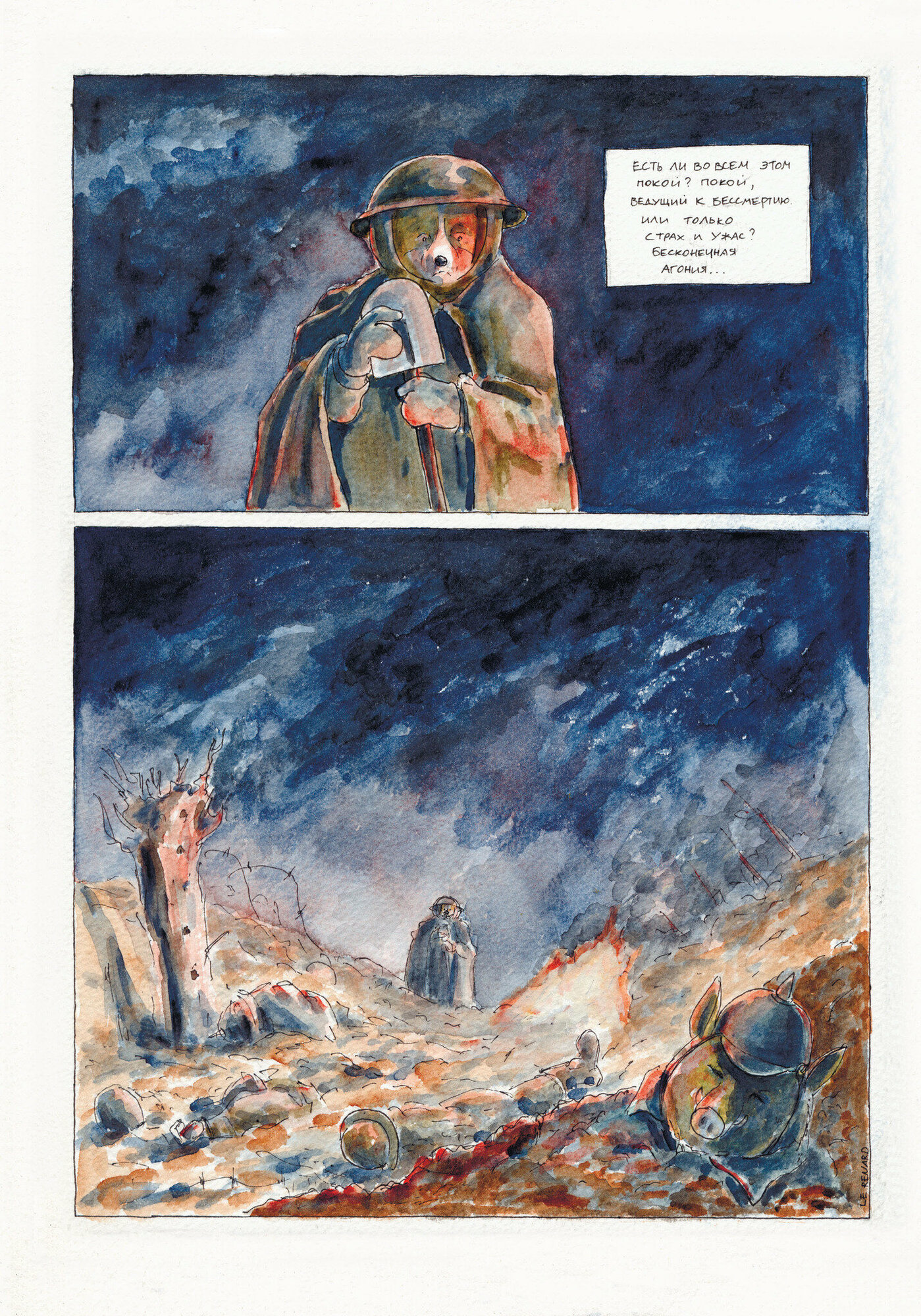 «Диптих» посвящен почти невостребованной у нас теме Первой мировой войны и рассказывает о двух героях, разведенных по разные стороны линии фронта. Отчаяние, дружба, поиски смысла и спасения, воля случая - «Диптих» не столько боевик, сколько военная драма о судьбах людей, попавших в этот ад. Точнее, антропоморфных животных - следуя за давней комикс-традицией, Трошин рассказывает очень человечную историю без использования людей. Зато здесь важен каждый цвет, каждый оттенок, каждый штрих - ведь в них вложен почти год работы автора.
