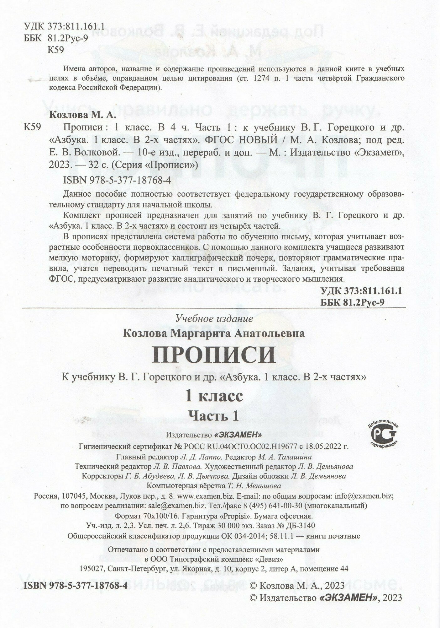 Сервис сравнения цен СкидкаГИД предлагает сравнить цены на товар «Книга: Прописи 1 класс Часть 1 К учебнику В Г Горецкого и др Азбука 1 класс В 2-х частях (Козлова Маргарита Анатольевна); Экзамен, 2023»