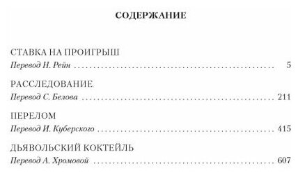 В сборник вошли увлекательные романы, созданные на рубеже 1960-1970-х годов: "Ставка на проигрыш", "Расследование", "Перелом" и "Дьявольский коктейль".