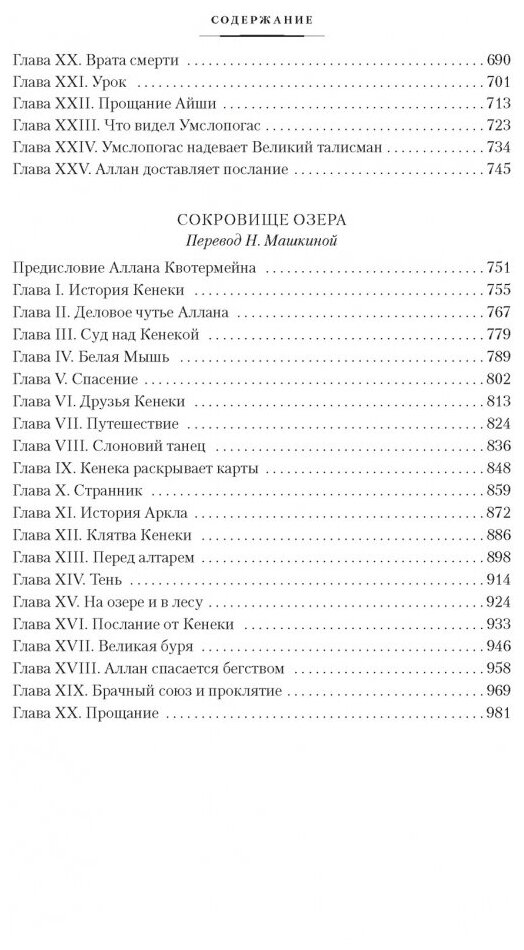 Цикл приключений Аллана Квотермейна продолжают "Священный цветок", "Чудовище по имени Хоу-Хоу", "Она и Аллан" (роман выходит в новом переводе), "Сокровище озера". Эти произведения печатаются с сохранением примечаний английских издателей. Книга иллюстрирована классическими рисунками Мориса Грайфенхагена и замечательной графикой Елены Шипицыной.