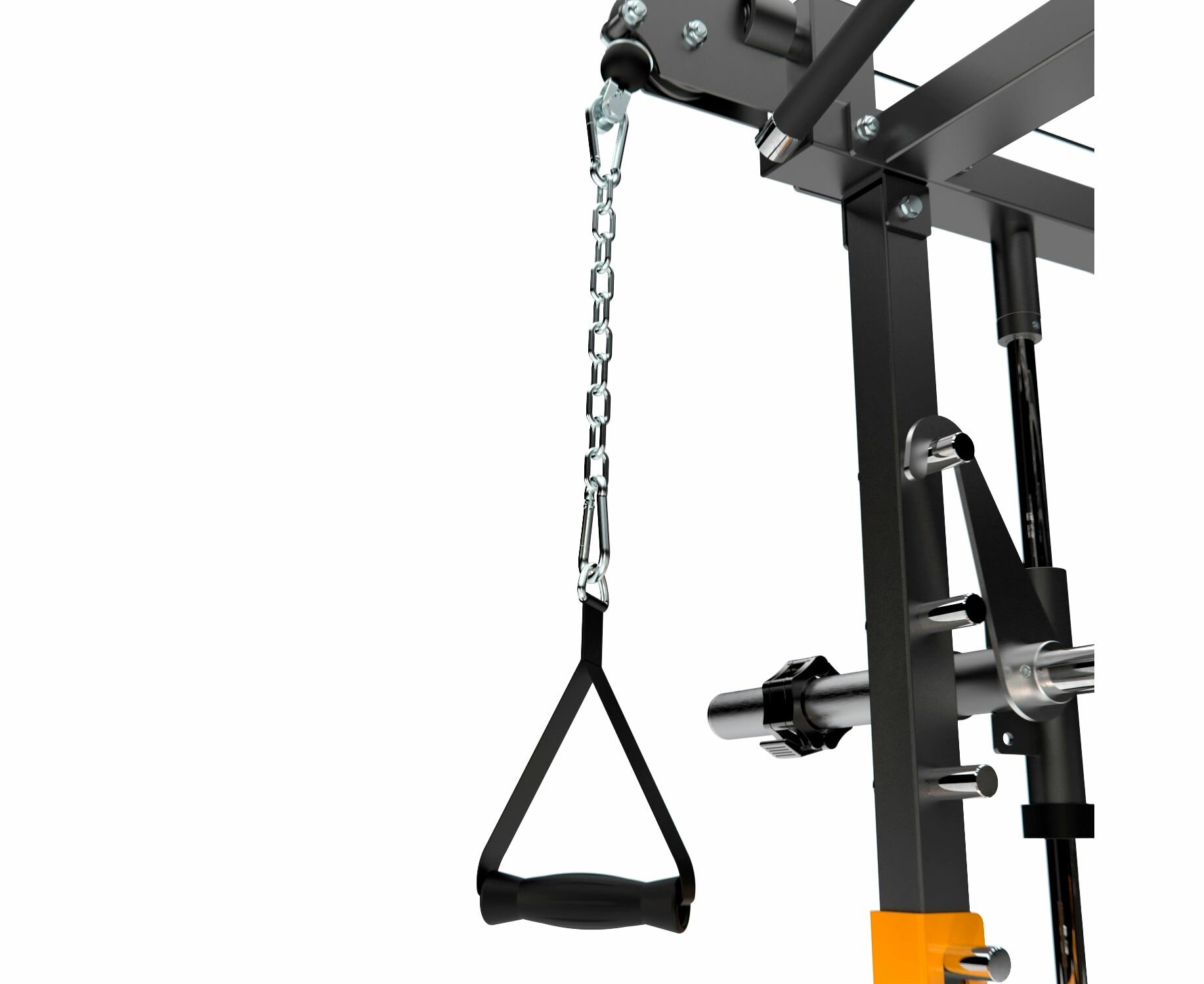 Конструкция устойчивая и долговечная: тросы толщиной 5 мм легко выдерживают постоянное использование, а корпус из профиля 50 х 70 х 2 мм сохранит устойчивость во время самых активных тренировок.
