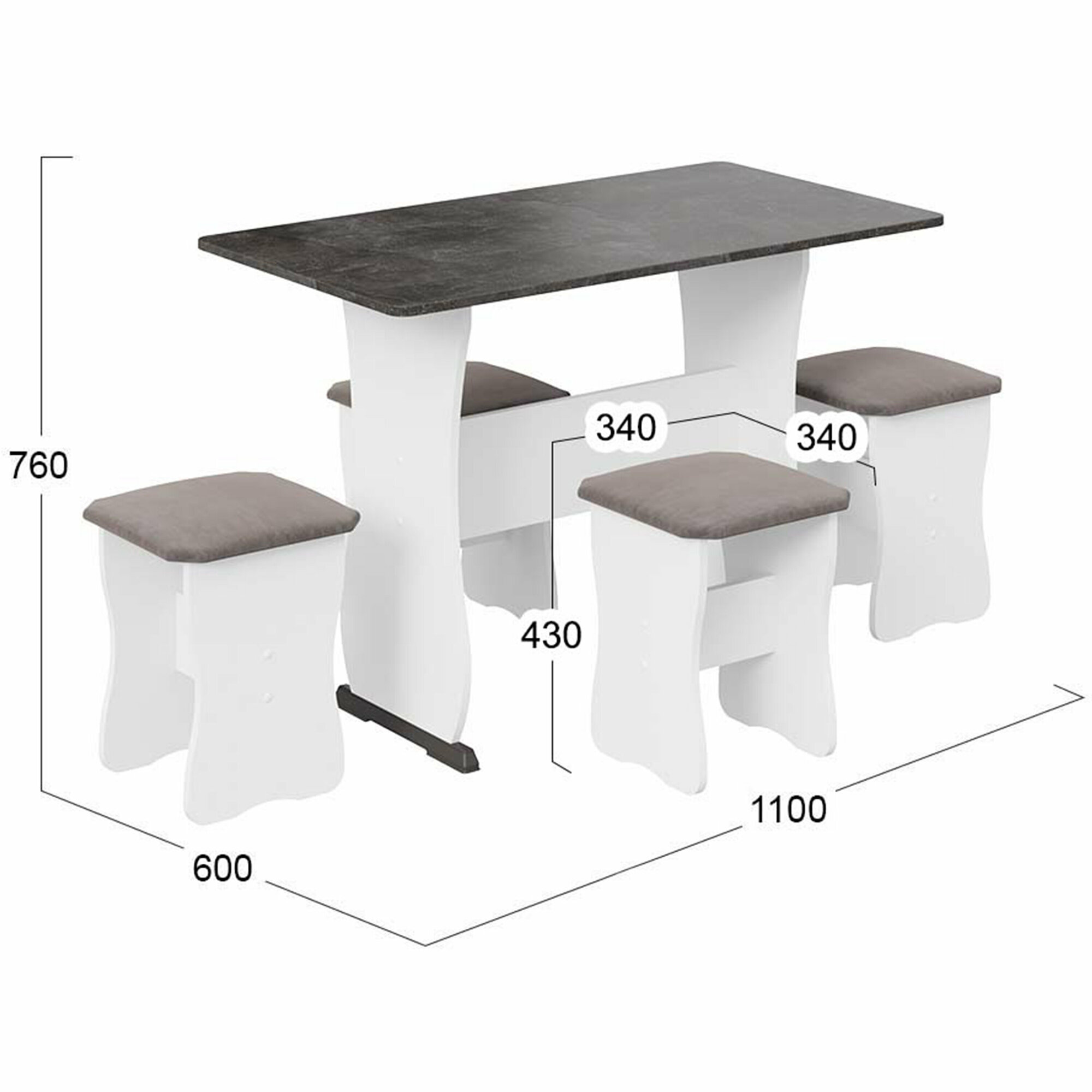 Обеденная группа Тип 1 – это комплект, состоящий из стола и табуретов, изготовленный в одном стилистическом решении. Классический дизайн, доступная цена и разнообразие расцветок набора позволяют приобрести подходящую модель для помещения, оформленного в любом стиле. характеристики мебели: * Декор: Белый/Дуб крафт золотой/Иск. замша Latte * Материал каркаса: ЛДСП 16мм, кромка ПВХ; * Материал обивки: искусственная замша; * Размер стола: 1100 х 600 х 760 мм; * Размер табурета: 340 х 340 х 430 мм.