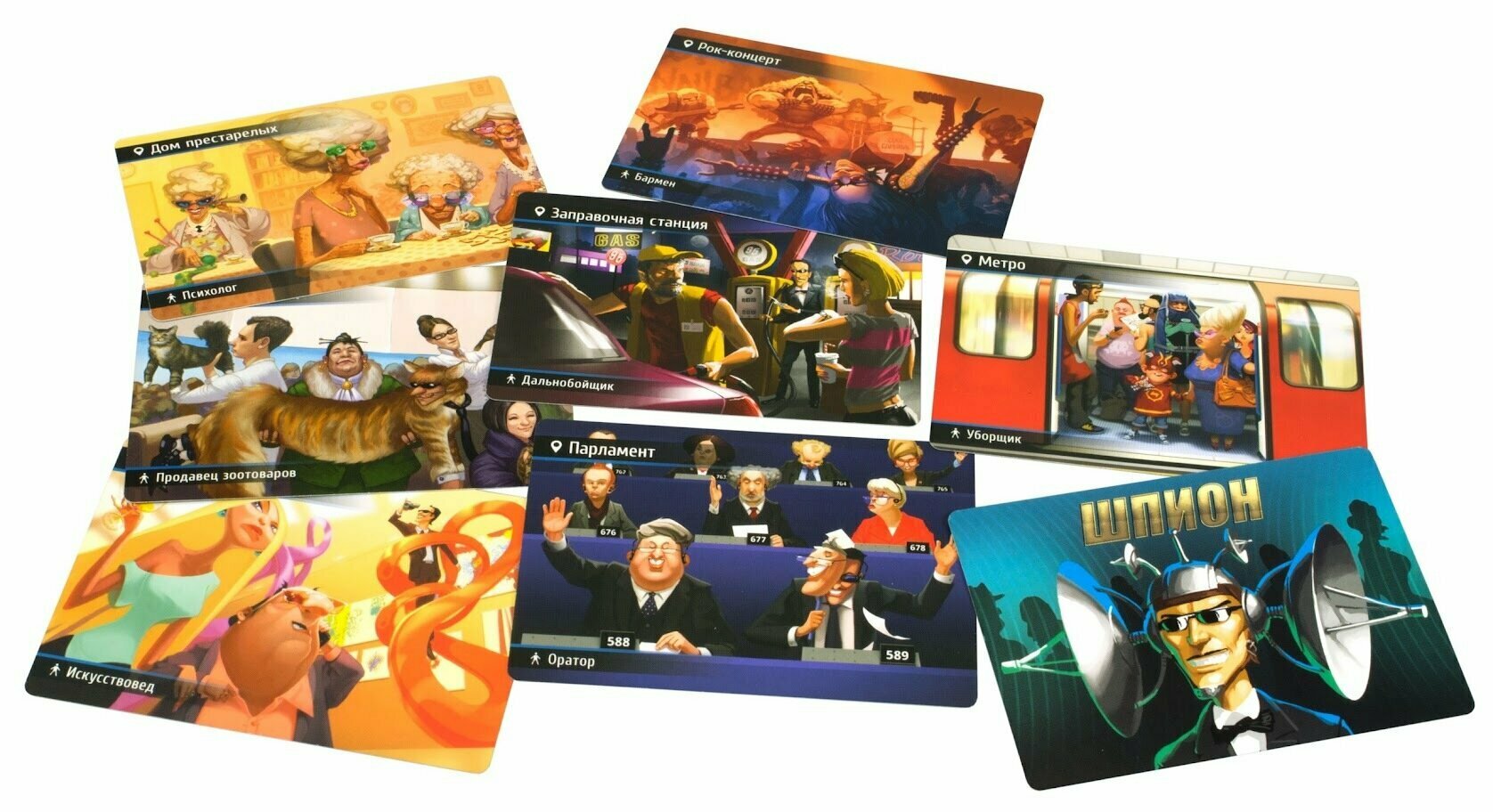 Подготовка к игре очень проста: все игроки получают по одной карте так, что не видят карт других. Карты обозначают локацию, в которой оказались игроки... кроме одной: на ней локации нет, есть только одно слово Шпион. Его-то все и должны поймать.