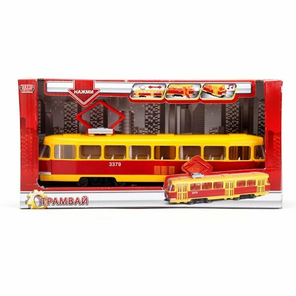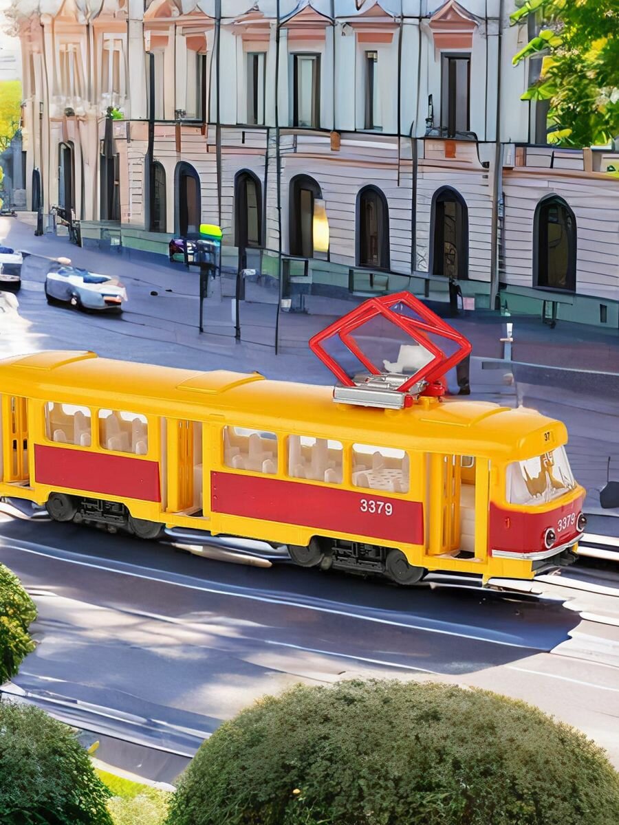 Великолепная модель ретро-трамвая, который колесил по улицам российских городов в советское время, сделан из пластика. Он в точности повторяет внешний вид и салон этого красно-жёлтого транспорта. Малыши будут с удовольствием играть с трамваем, у которого установлен инерционный механизм, световые и звуковые спецэффекты.