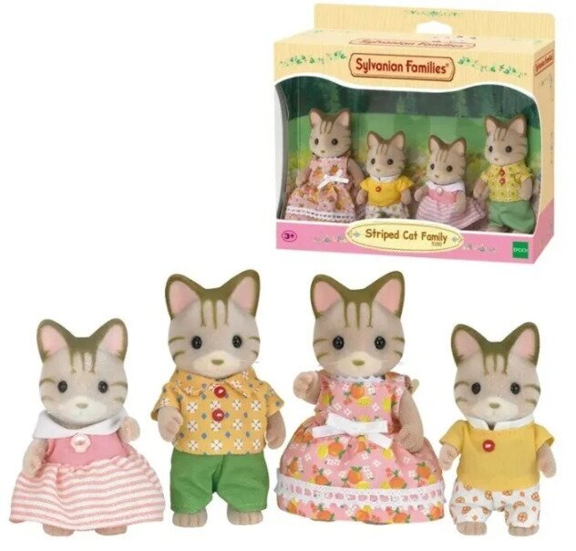 Семья полосатых Кошек Sylvanian Families - новый игровой набор для детей старше 4 лет. В комплекте - мама, папа и два полосатых котенка. Все члены большой кошачьей семьи одеты в цветастые наряды. Одежда снимается. Шерстка кошечек сделана из мягкого флокированного материала.