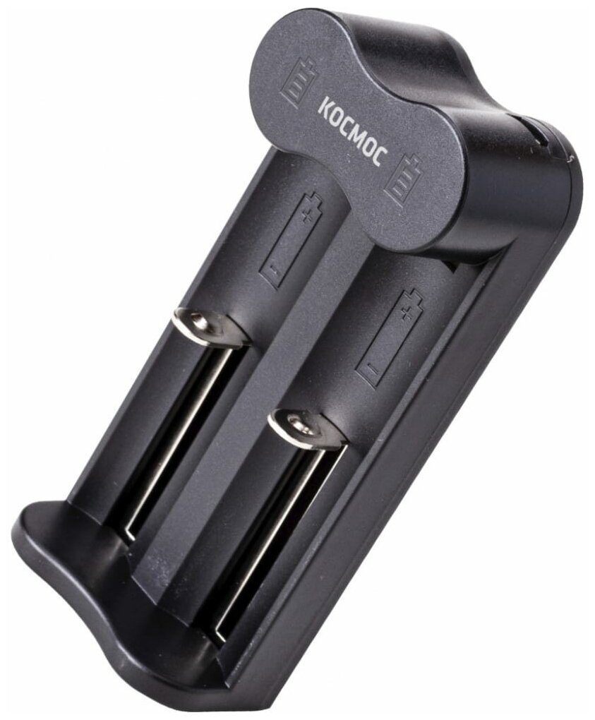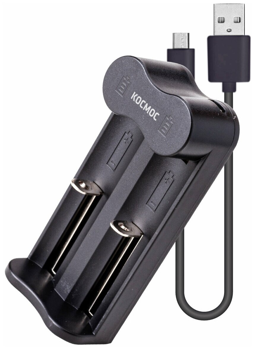 Космос Зарядное устройство Зарядное устройство для Li-Ion аккумуляторов питание от USB шнур. Умное зарядное устройство с Автоотключением. Время заряда зависит от ёмкости аккумулятора. Раздвижные слоты совместимы с любыми типоразмерами цилиндрических литий-ионных аккумуляторов, которые часто используются в фонарях или вейп-испарителях. Заряжает 1-2 шт. 16340/17335/18490/18650/20700. Слим-Дизайн: удобно класть в сумку для ноутбука. Не занимает розетку, легко подключить к ноутбуку или к адаптеру зарядки телефона.
