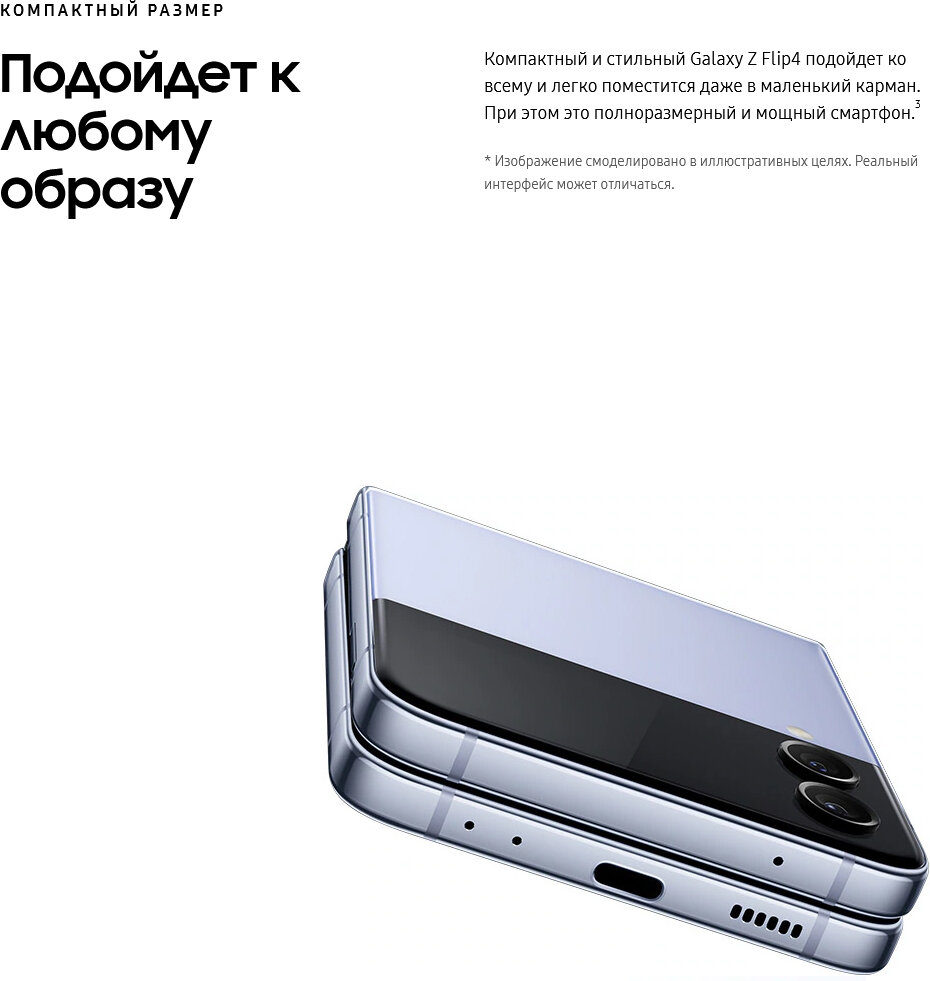 Экран 6.7 дюймов отличается великолепным изображением благодаря стеклу Ultra Thin Glass. К надежности тоже нет никаких вопросов, ведь оно выдерживает до 200 000 складываний. Конструкция Galaxy Z Flip4 надежна в каждом аспекте. Это наши самые прочные складные смартфоны благодаря эксклюзивному стеклу Corning Gorilla Glass Victus+. А шарнир защищен прочной алюминиевой рамкой Armor Aluminum. Боитесь, что телефон намокнетx Это первые в мире складные водонепроницаемые смартфоны. Они выдерживают погружение на 1, 5 метра до 30 минут без каких-либо проблем. Запас энергии достаточен, чтобы говорить практически без умолку. Обновленный 4-нанометровый процессор и емкий аккумулятор на 3700 мАч обеспечивает работу смартфона долгие часы. Поддерживается сверхбыстрая проводная зарядка и быстрая беспроводная зарядка Fast Wireless Charging 2.0. Такое количество заряда позволяет делиться им с другом или подзаряжать наушники с помощью функции Wireless PowerShare.