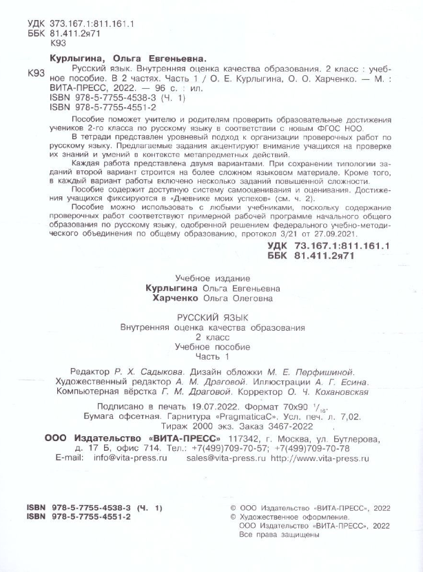 Русский язык. 2 класс. Внутренняя оценка качества образования. Учебное пособие. Часть 1. (Курлыгина Ольга Евгеньевна, Харченко Ольга Олеговна); Вита-Пресс, 2022