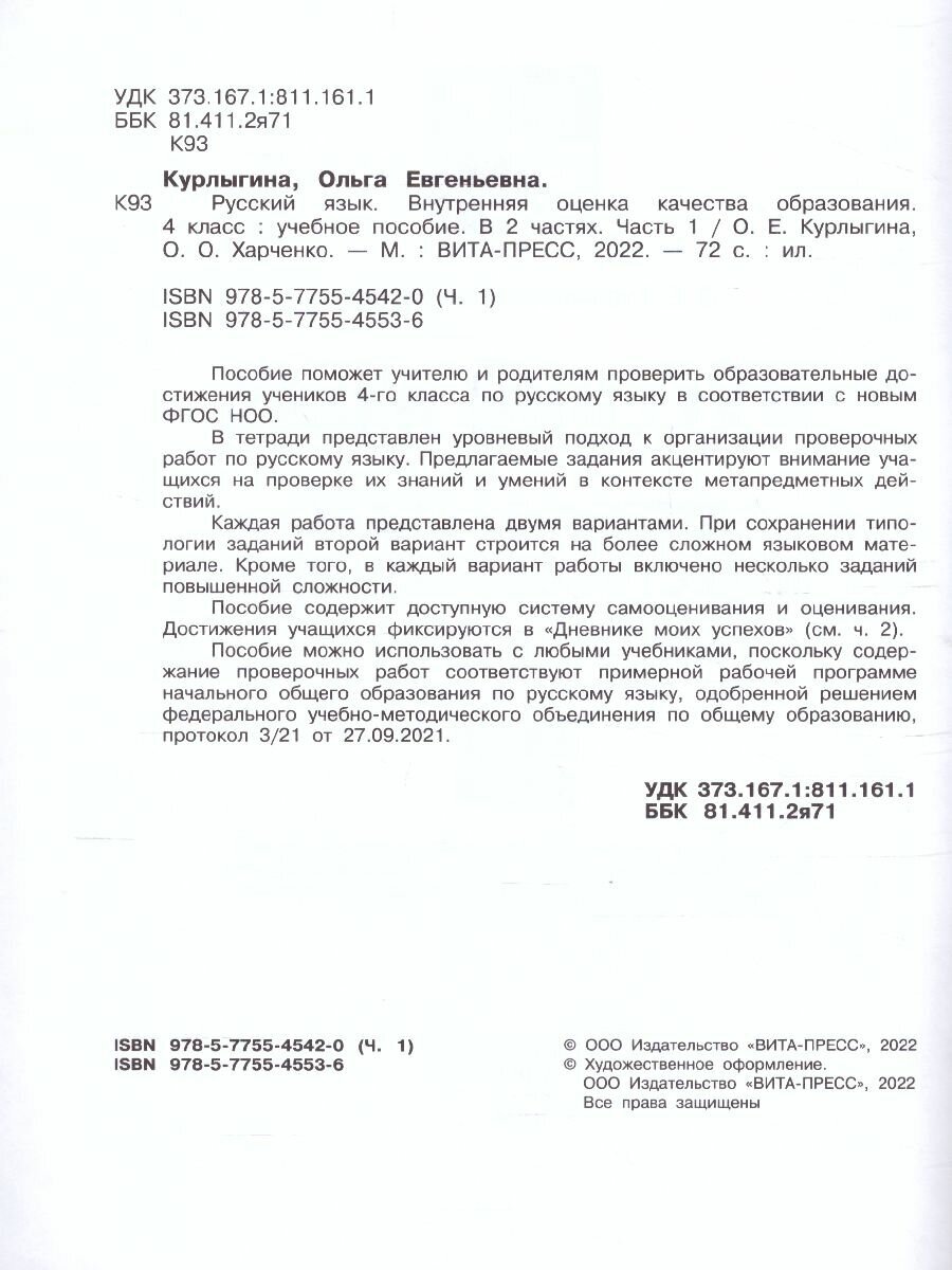 Русский язык. 4 класс. Внутренняя оценка качества образования. Учебное пособие. Часть 1. (Курлыгина Ольга Евгеньевна, Харченко Ольга Олеговна); Вита-Пресс, 2022