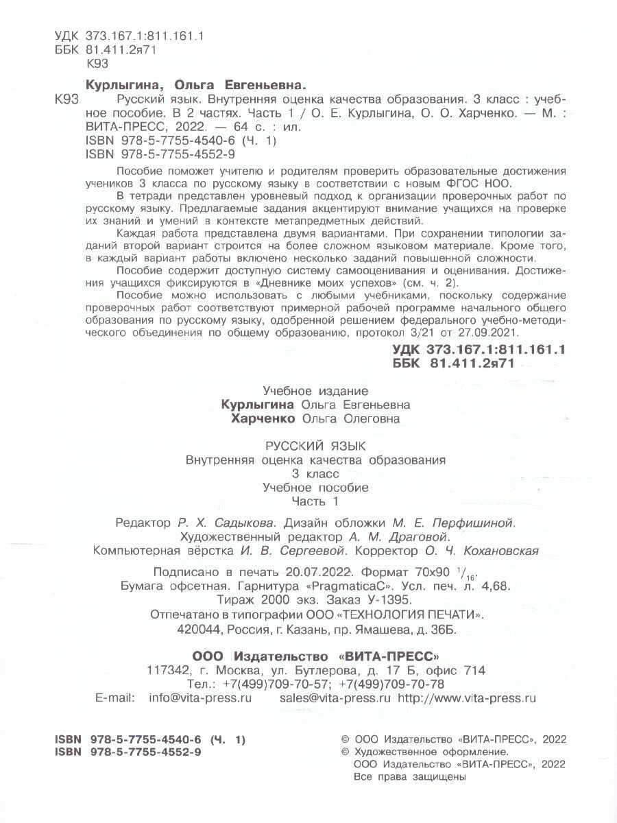 Русский язык. 3 класс. Внутренняя оценка качества образования. Учебное пособие. Часть 1. (Курлыгина Ольга Евгеньевна, Харченко Ольга Олеговна); Вита-Пресс, 2022