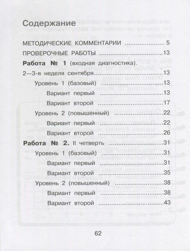Каждая из работ предлагается в двух вариантах. Вторая и следующие работы содержат задания первого (базового) и второго (повышенного) уровней. Проверочная работа по итогам освоения математики в 2-м классе также включает два уровня, в каждом из которых 2 варианта.