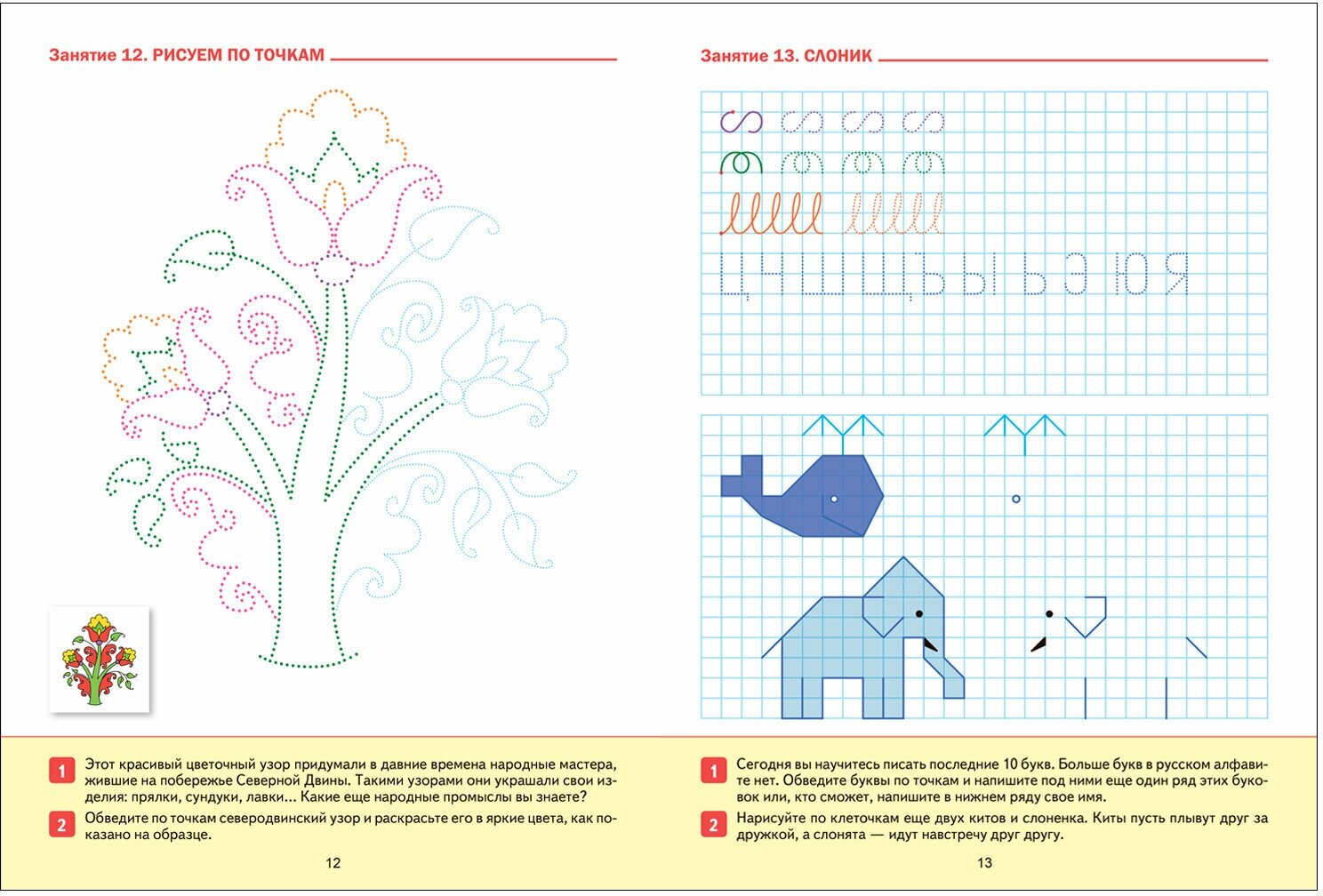 Задания в рабочей тетради, в виде интересных узоров, которые ребёнок должен постараться обвести, продолжить, дорисовать, повторить, раскрасить, обведения по пунктирным линиям букв, установления закономерности, рассчитаны на подготовку руки к письму, позволяют сделать занятия по письму занимательными и интересными. Пособие рассчитано на 32 занятия.