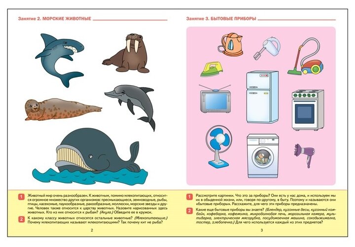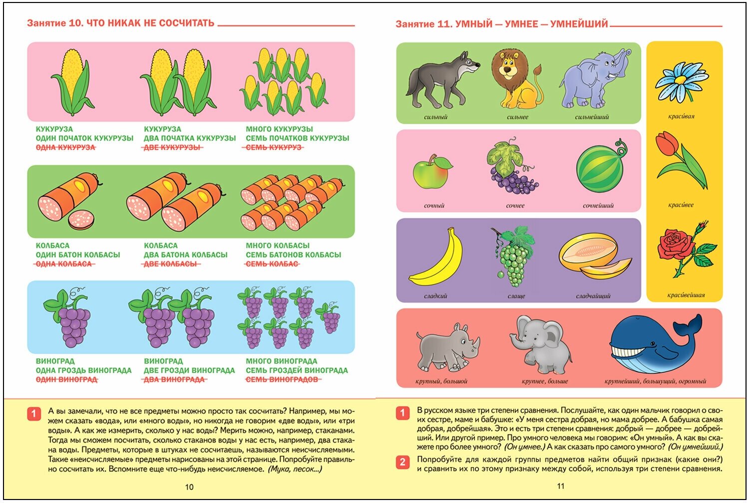 Выполняя задания, предложенные в тетради, дети учатся находить обобщающие слова, группировать знакомые предметы, находить среди них лишние и классифицировать их, правильно употреблять существительные в родительном падеже множественного числа, овладевая словарным составом слова. Дети знакомятся с многозначными словами, закрепляют способы образования существительных с суффиксами, придающие словам различные оттенки (уменьшительно-ласкательный, увеличения, уменьшения и др.), учатся способу образования глаголов с приставками, подбирать антонимы к ним и прилагательным, составлять рассказы по картинкам, выстраивать логическую цепочку, определяя, что происходило раньше, что потом.