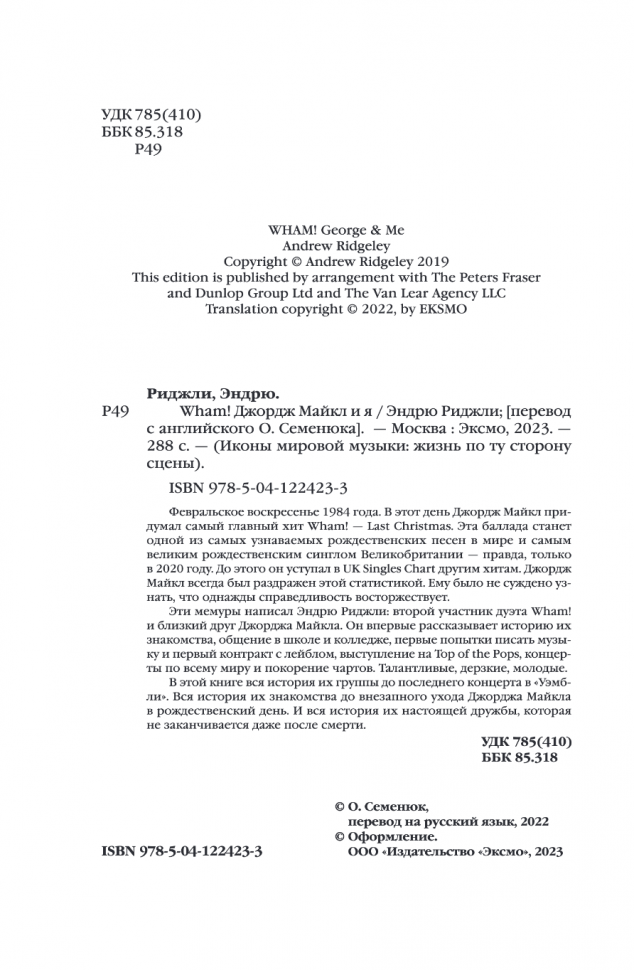 Эндрю Риджли вспоминает всю историю их дружбы и совестного творчества с Джорджем Майклом: от записи первых демо в гостиной родителей до головокружительного выступления на Top of the Pops, от первой встречи в школе до последнего концерта в «Уэмбли». Оба они были сыновьями отцов-эмигрантов, оба обожали музыку и мечтали заниматься только ею. Эта страсть вознесла их на вершину и подарила нам такие хиты, как Last Christmas, Careless Whisper, Wake Me Up Before You Go-Go, Everything She Wants и другие.