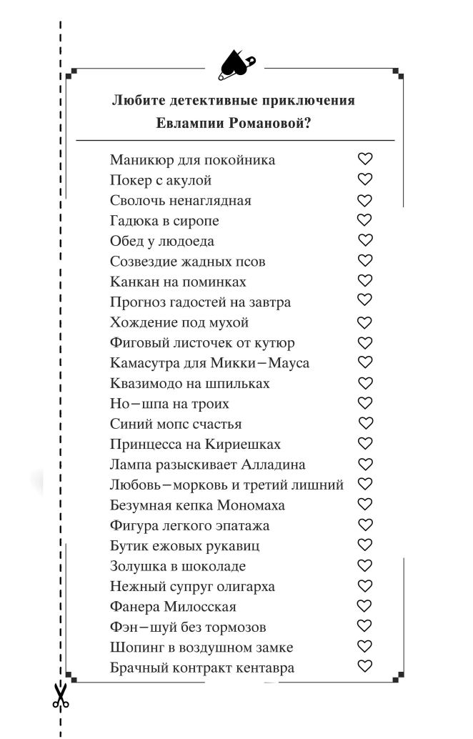 Эта книга очень четко подмечает разные жизненные ситуации, с которыми мы можем столкнуться. Порой кажется, что что-то странное может произойти с кем-то другим, но только не со мной. И читаешь книгу, а там какая-то такого рода история, и ты понимаешь, что в жизни возможно всё. Лёгкая для прочтения книга, интересный сюжет из серии книг про Евлампию. Очень рада, что новинки Дарьи Донцовой выходят весьма часто
