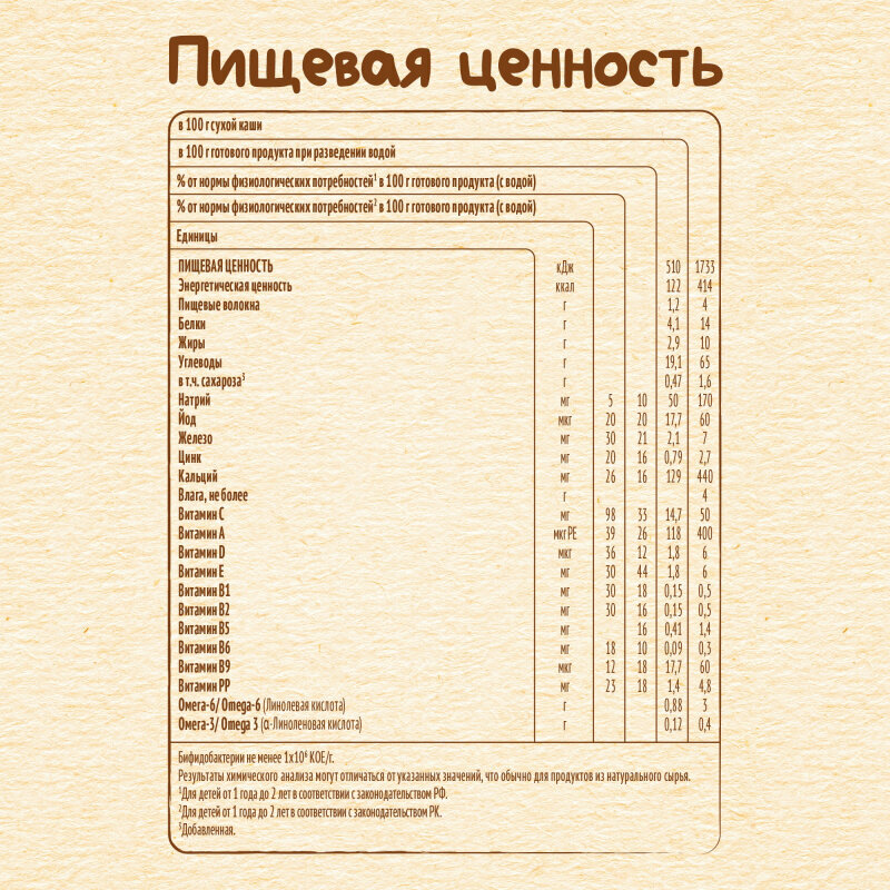| Состав | мука (пшеничная (52,4 %) (содержит глютен), овсяная (7,2 %) (содержит глютен), рисовая (1,8 %), кукурузная (1,8%)), молоко сухое обезжиренное (16,6 %), смесь растительных масел (низкоэруковое рапсовое, подсолнечное высокоолеиновое, подсолнечное), антиокислители (L-аскорбилпальмитат, альфа-токоферол, лимонная кислота), хлопья овсяные (5,2 %) (содержат глютен), кусочки земляники садовой (3,1 %) (сахар, земляника, крахмал кукурузный), хлопья малины (1 %), кусочки яблока (1 %), минеральные вещества (кальция карбонат, железа (II) фумарат, цинка сульфат, йодид калия), витамины (С (L-аскорбиновая кислота), E (DL-альфа-токоферола ацетат), РР (никотинамид), B5 (D-пантотенат кальция), A (ретинола ацетат), В1 (тиамина мононитрат), В6 (пиридоксин гидрохлорид), В2 (рибофлавин), B9 (фолиевая кислота), D (D3 холекальциферол)), бифидобактерии не менее 1х10^6 КОЕ/г |