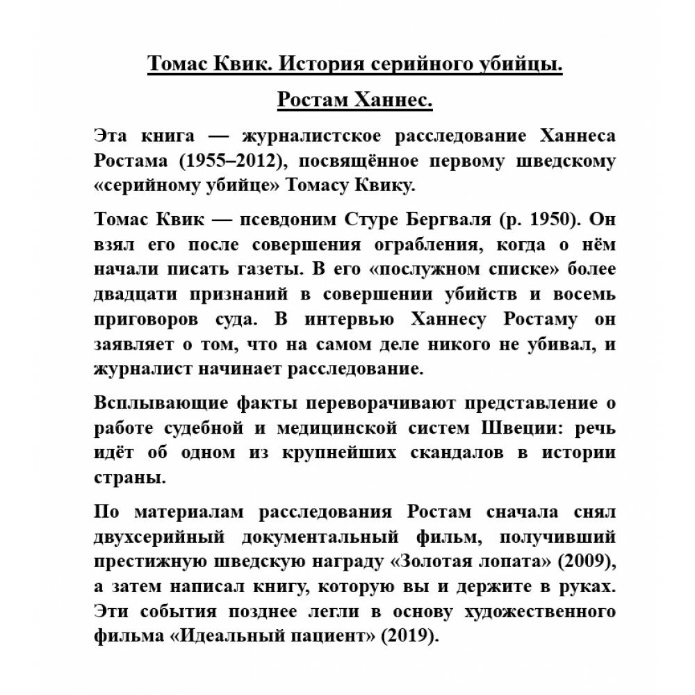 Очень люблю книги, основанные на реальных событиях. И эта не стала исключением. Томас Квик - вымышленное имя существующего на самом деле человека, Стуре Бергвале. В свое время его история получила огромную огласку в Швеции, в связи с признанием более чем в 38 убийствах.