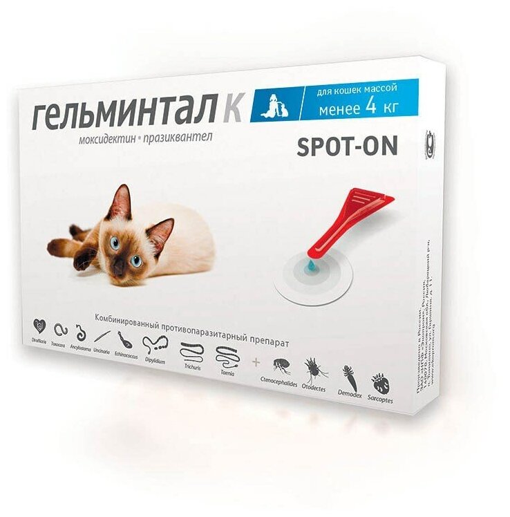 Препараты Гельминтал - новое поколение антигельминтиков, обладающих повышенной эффективностью и безопасностью. Они успешно заменяют традиционные препараты, к которым выработана резистентность паразитов. Необходимый эффект достигается за счет уникальной комбинации действующих веществ: моксидектин + празиквантел. Гельминтал Спот-ОН - раствор для наружного применения при гельминтозах и арахноэнтомозах кошек. Назначение:Гельминтал К назначают кошкам с лечебной и профилактической целью против личиночных и половозрелых фаз развития кишечных нематод (токсокароз, токсаскаридоз, унцинариоз, анкилостомоз), цестодозах (тениидозы, дипилидиоз, эхинококкозы), энтомозах, вызванных блохами и власоедами, демодекозе, отодектозе и нотоэдрозе, а также для профилактики дирофиляриоза.Порядок применения:Препарат применяют кошкам путем капельного "spot-on" нанесения на сухую неповрежденную кожу. Перед использованием у пипетки отламывают верхнюю часть, препарат наносят животному на кожу в места, недоступные для слизывания - в область шеи у основания черепа.