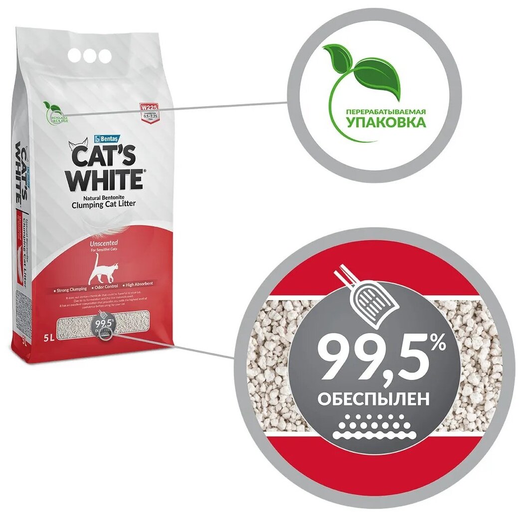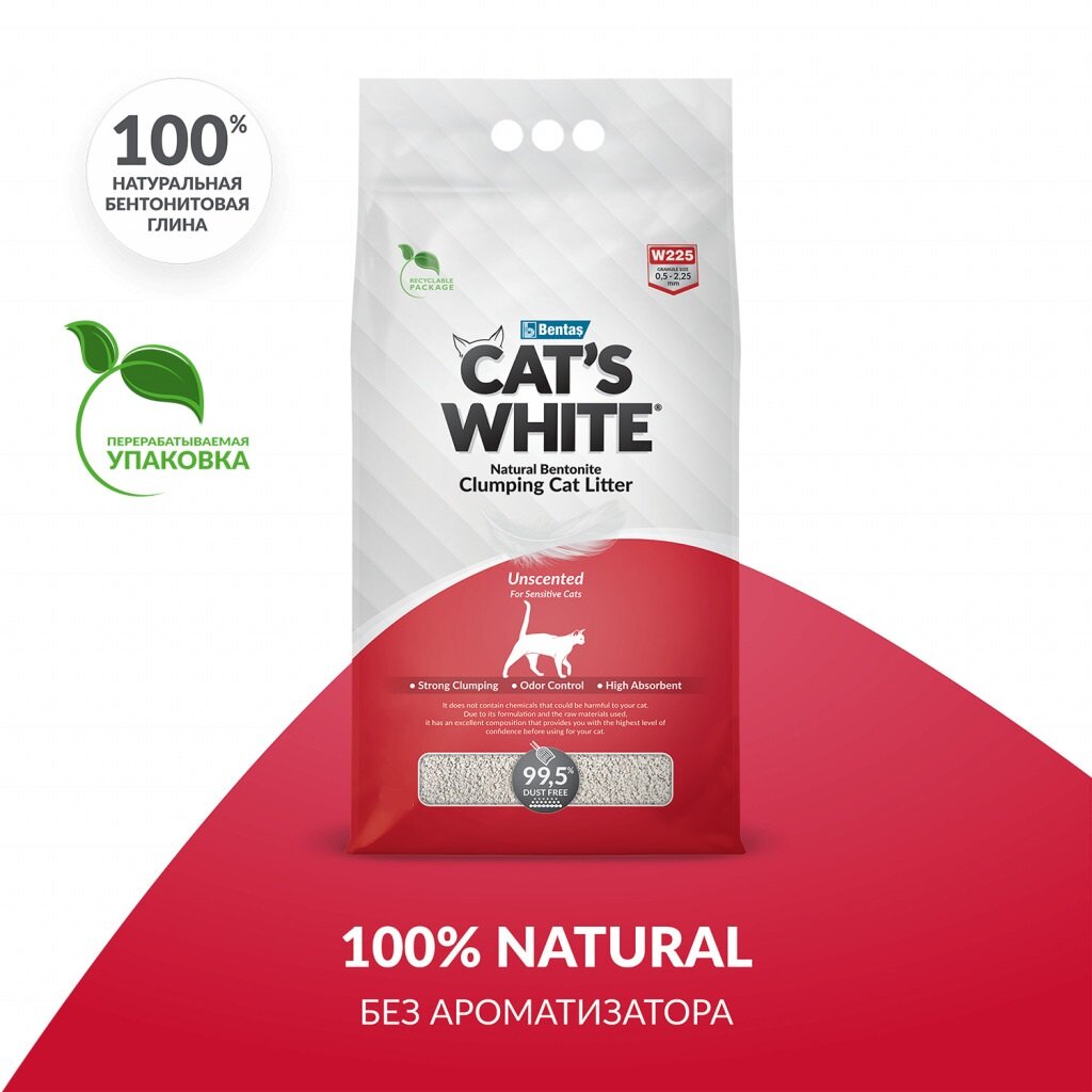 Мягкая премиальная эко-упаковка CAT’S WHITE NATURAL UNSCENTED полностью подлежит переработке.