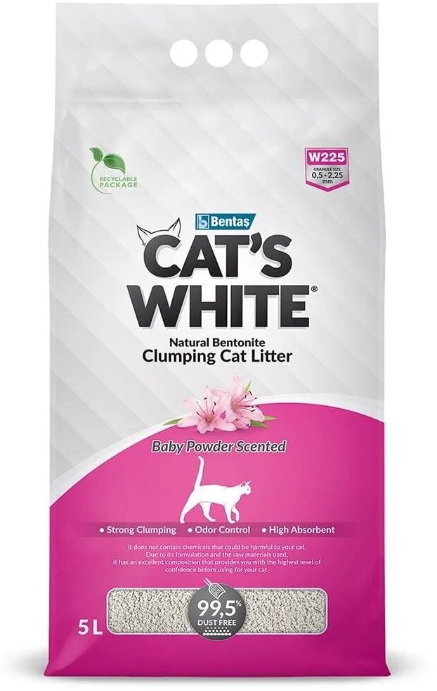 это белый наполнитель для кошачьего туалета из 100% натуральной бентонитовой глины с ароматом детской присыпки.