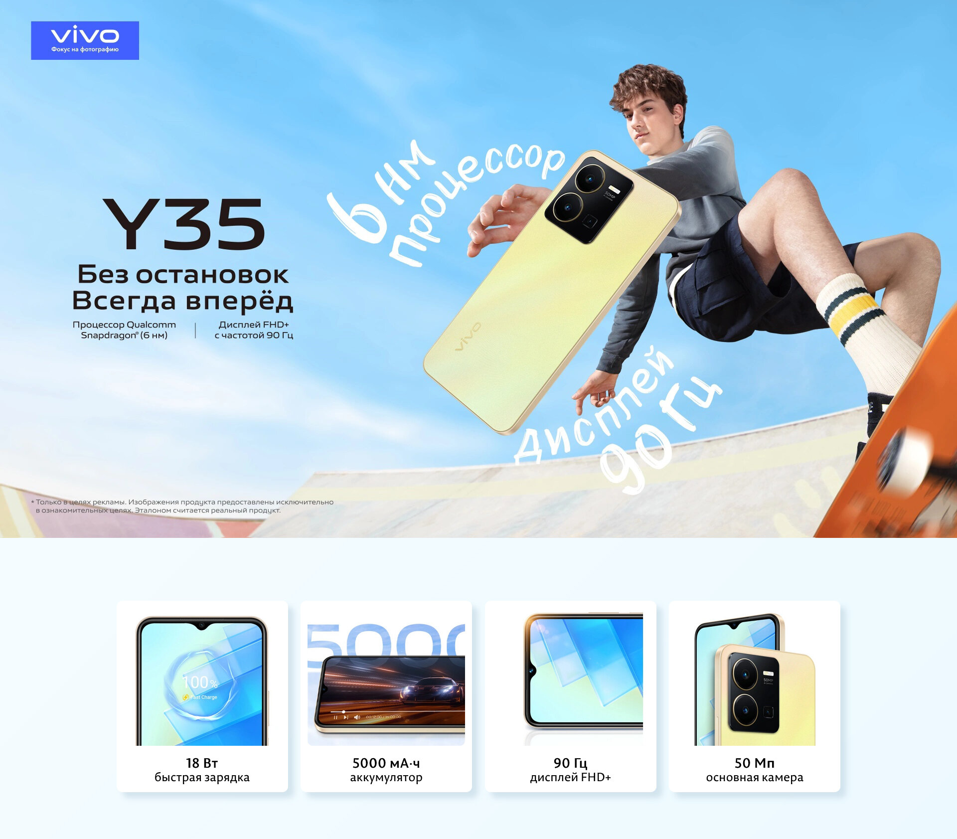 Смартфон Vivo Y35 оснащен процессором Snapdragon 680. Он содержит восемь вычислительных ядер Kryo 265 с тактовой частотой до 2,4 ГГц, графический ускоритель Adreno 610 и модем Snapdragon X11 LTE. Объём оперативной памяти составляет 4 Гбайт. Устройство оборудовано 6,58-дюймовым дисплеем Full HD+ с разрешением 2408x1080 точек, частотой обновления 90 Гц, пиковой яркостью 550 кд/м2 и 96-процентным охватом цветового пространства NTSC. Во фронтальной части располагается 16-мегапиксельная камера. Тройная тыльная камера объединяет 50-мегапиксельный основной блок, 2-мегапиксельный модуль для получения информации о глубине сцены и 2-мегапиксельный сенсор для макросъёмки. Флеш-накопитель обладает вместимостью 64 Гбайт. Есть боковой сканер отпечатков пальцев, адаптеры Wi-Fi 802.11ac и Bluetooth 5.0, приёмник GPS/ГЛОНАСС/QZSS, порт USB Type-C. Питание обеспечивает аккумуляторная батарея ёмкостью 5000 мА·ч с 44-ваттной зарядкой.