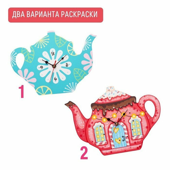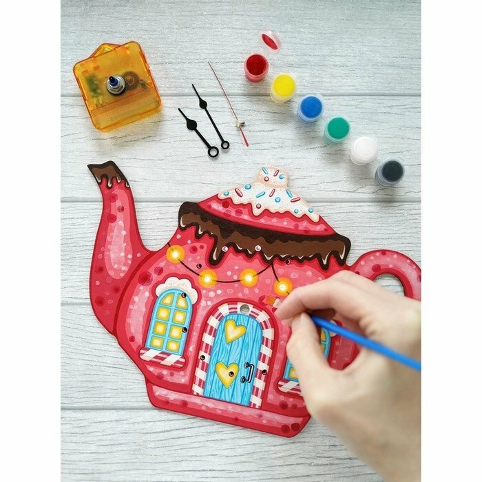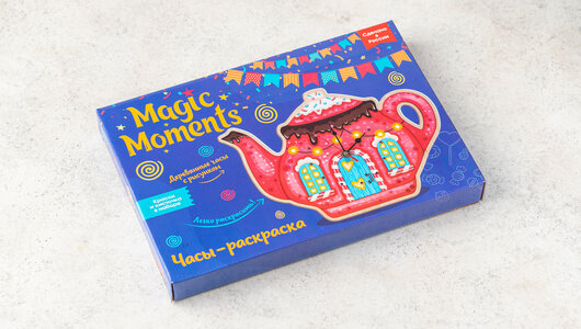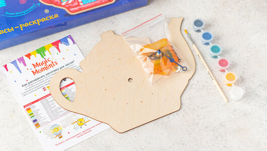 Этот красивый чайник так и хочется съесть! С помощью этого набора вы сможете создать настоящие часы своими руками. Внутри находится деревянная заготовка в форме чайника, так что вы можете повторить рисунок с коробки по пошаговой схеме или создать свой дизайн. После раскрашивания вам останется прикрепить простой часовой механизм к заготовке, в этом вам поможет подробная инструкция. Часы отлично подойдут для детской комнаты, так как у них бесшумный механизм, который не будет отвлекать ребенка.