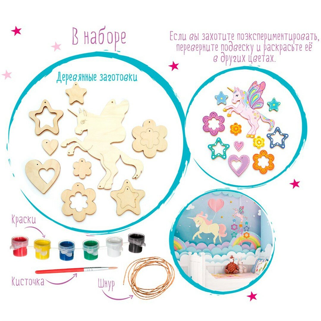 В наборе: деревянные заготовки для раскрашивания, акриловые краски и кисть, шнур для сборки подвески.