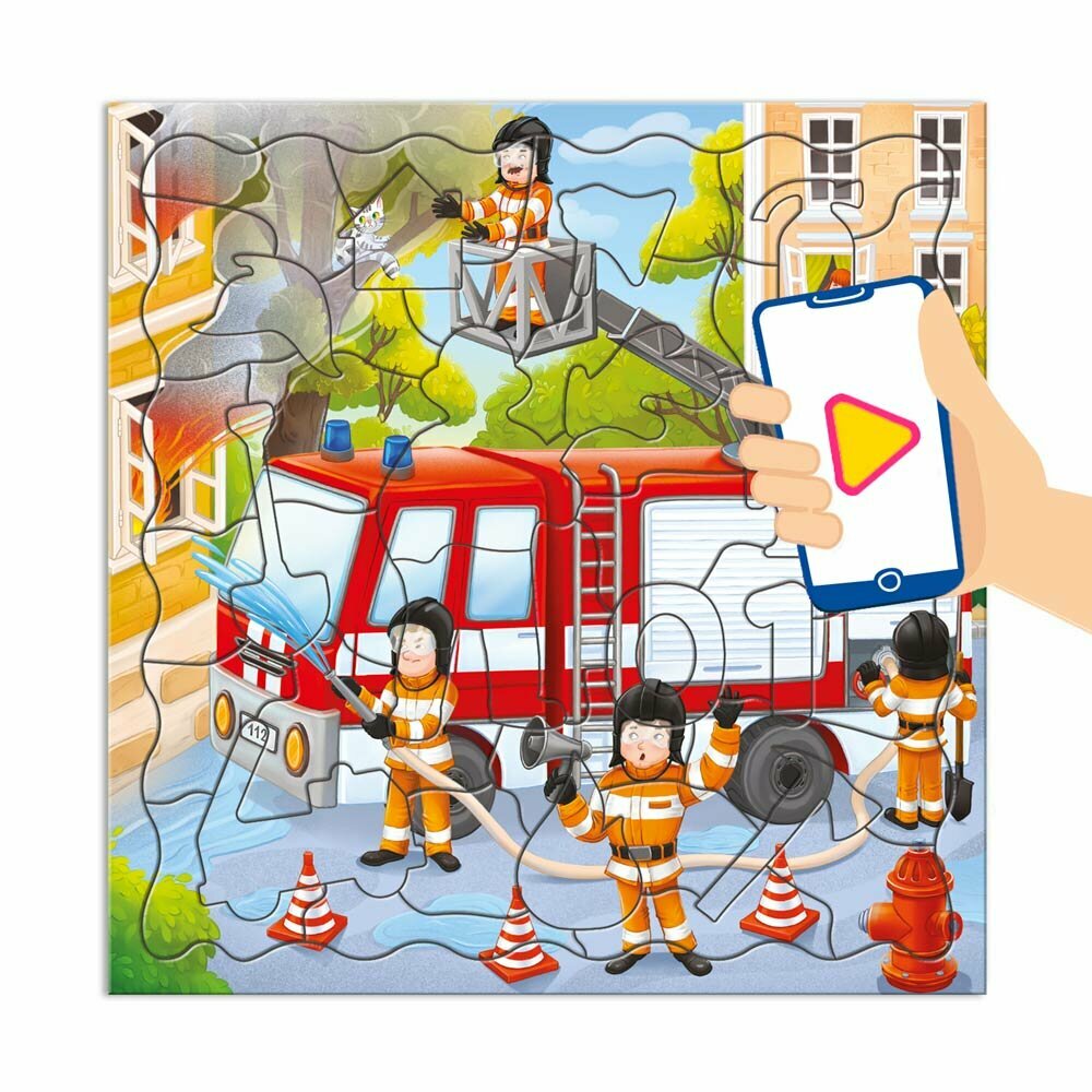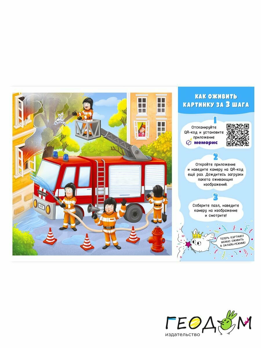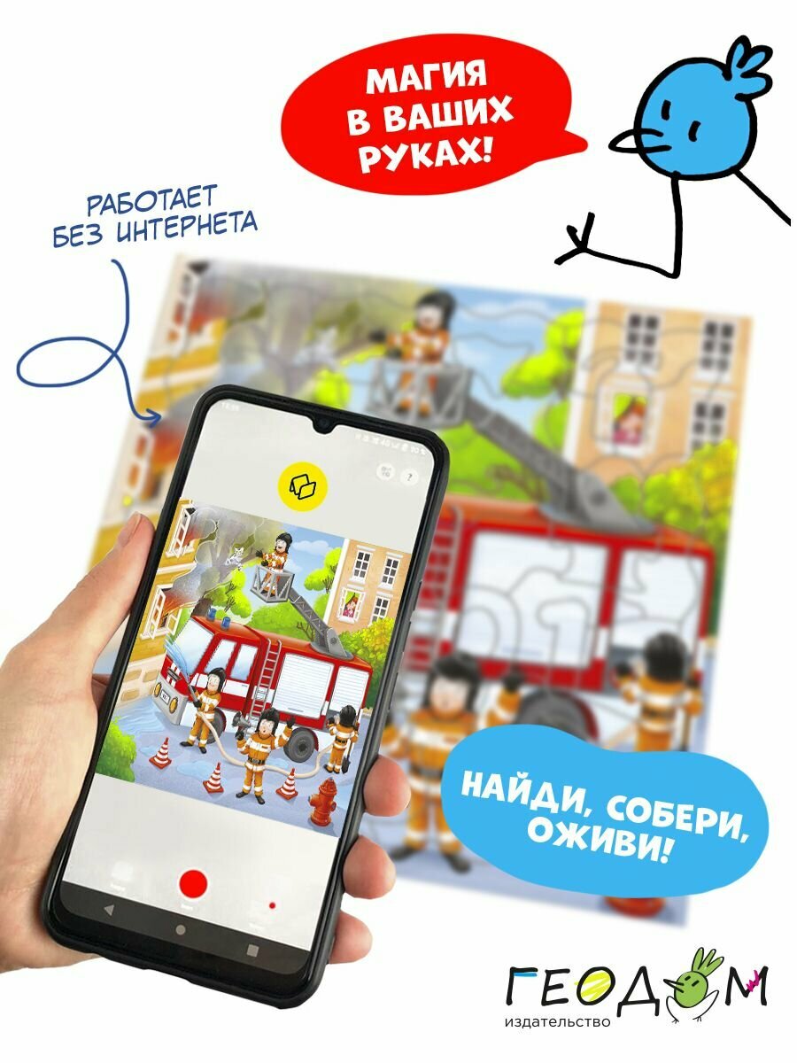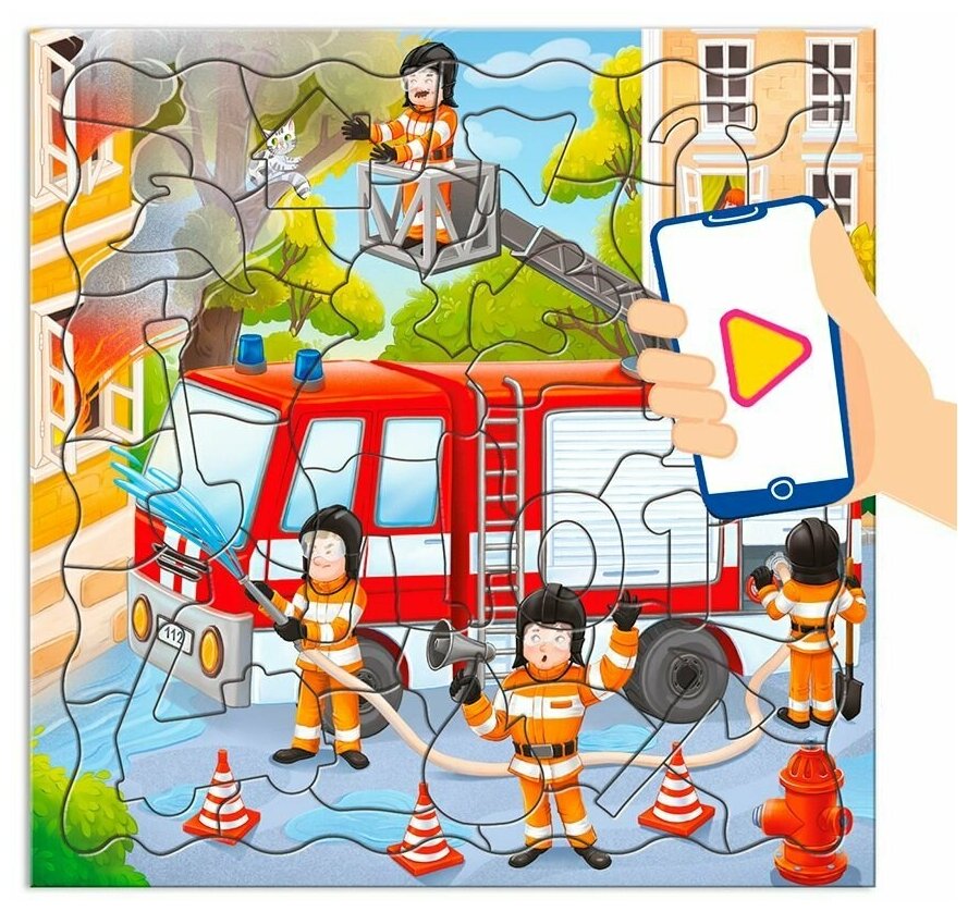 Слышишь звук сирены? Это пожарная машина спешит на помощь! Правильно сложи все фрагменты - и увидишь, как работает команда отважных пожарных. Среди элементов пазла - фигурка пожарного, каска, огнетушитель, инструменты и даже пламя! Отсканируй QR-код, наведи камеру на изображение - и картинка со звуком оживёт. Пазл тренирует мелкую моторику, внимание, память и способствует развитию мышления. А благодаря рамке и фрагментам из плотного картона пазл удобно хранить и брать с собой.