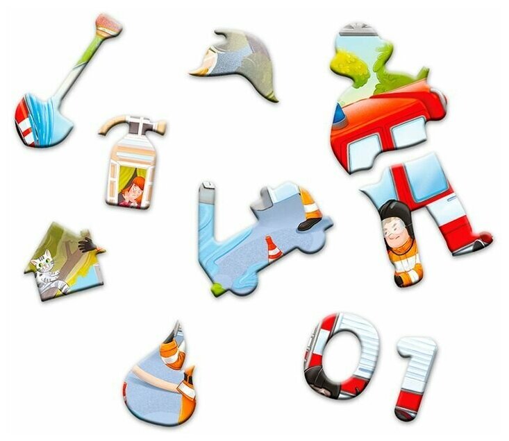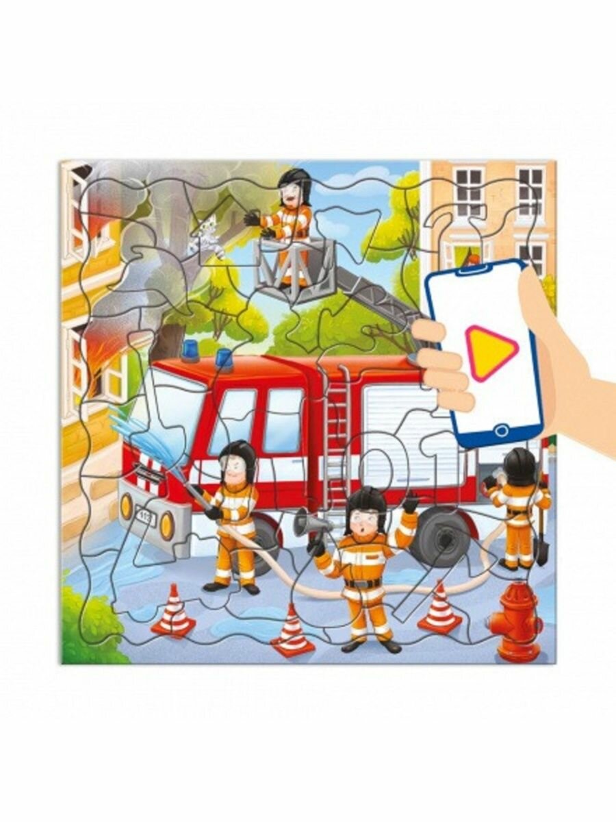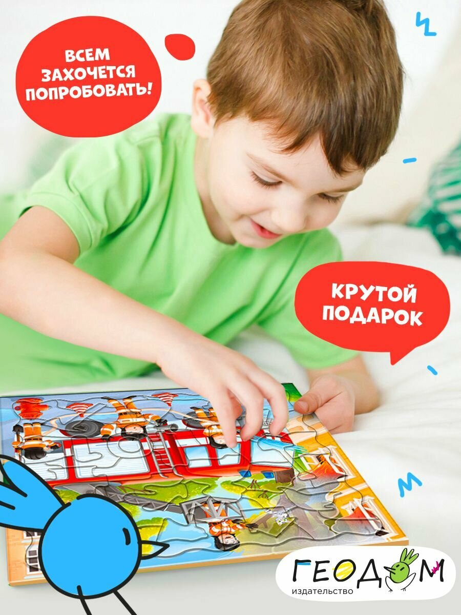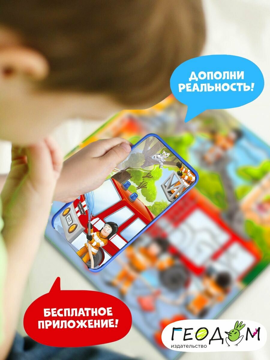 Слышишь звук сирены? Это пожарная машина спешит на помощь! Правильно сложи все фрагменты - и увидишь, как работает команда отважных пожарных. Среди элементов пазла - фигурка пожарного, каска, огнетушитель, инструменты и даже пламя! Отсканируй QR-код, наведи камеру на изображение - и картинка со звуком оживёт. Пазл тренирует мелкую моторику, внимание, память и способствует развитию мышления. А благодаря рамке и фрагментам из плотного картона пазл удобно хранить и брать с собой.