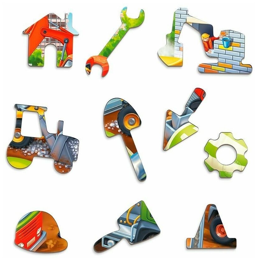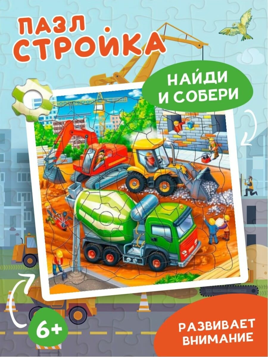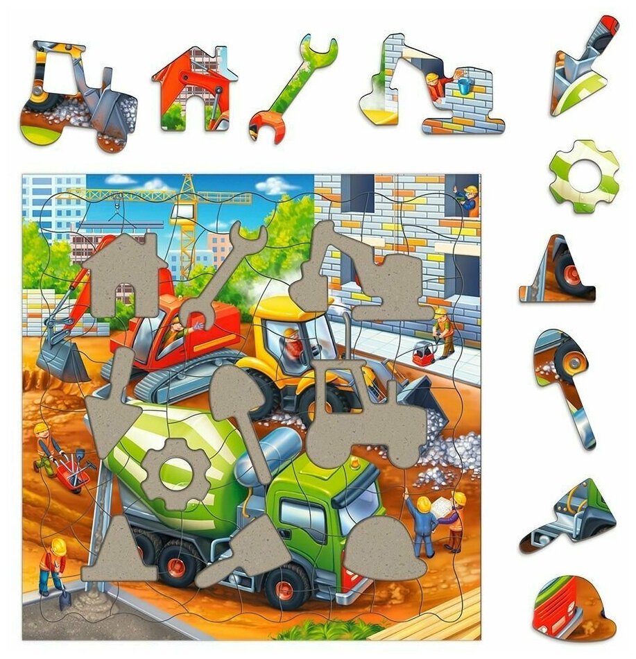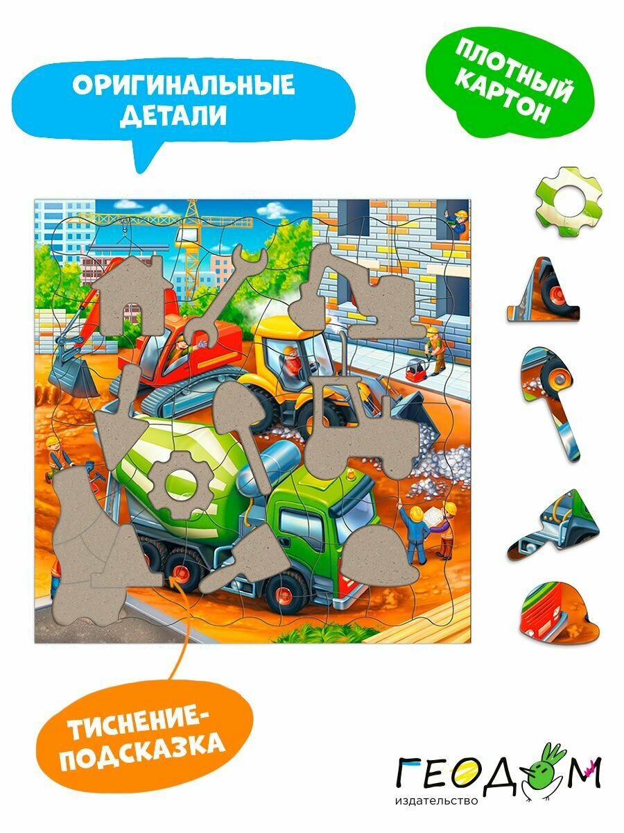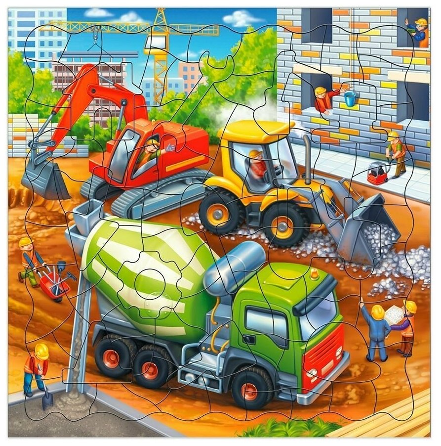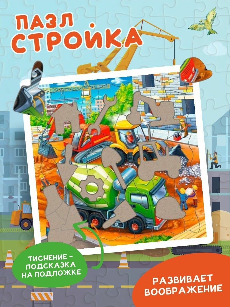 Готов побывать на настоящей стройке? Правильно сложи все фрагменты - и увидишь, как работает бригада опытных строителей. Элементы пазла - инструменты, которые понадобятся для строительства дома! Собирай, играй и рассматривай! Пазл тренирует мелкую моторику, внимание, память и способствует развитию мышления. А благодаря рамке и фрагментам из плотного картона пазл удобно хранить и брать с собой.