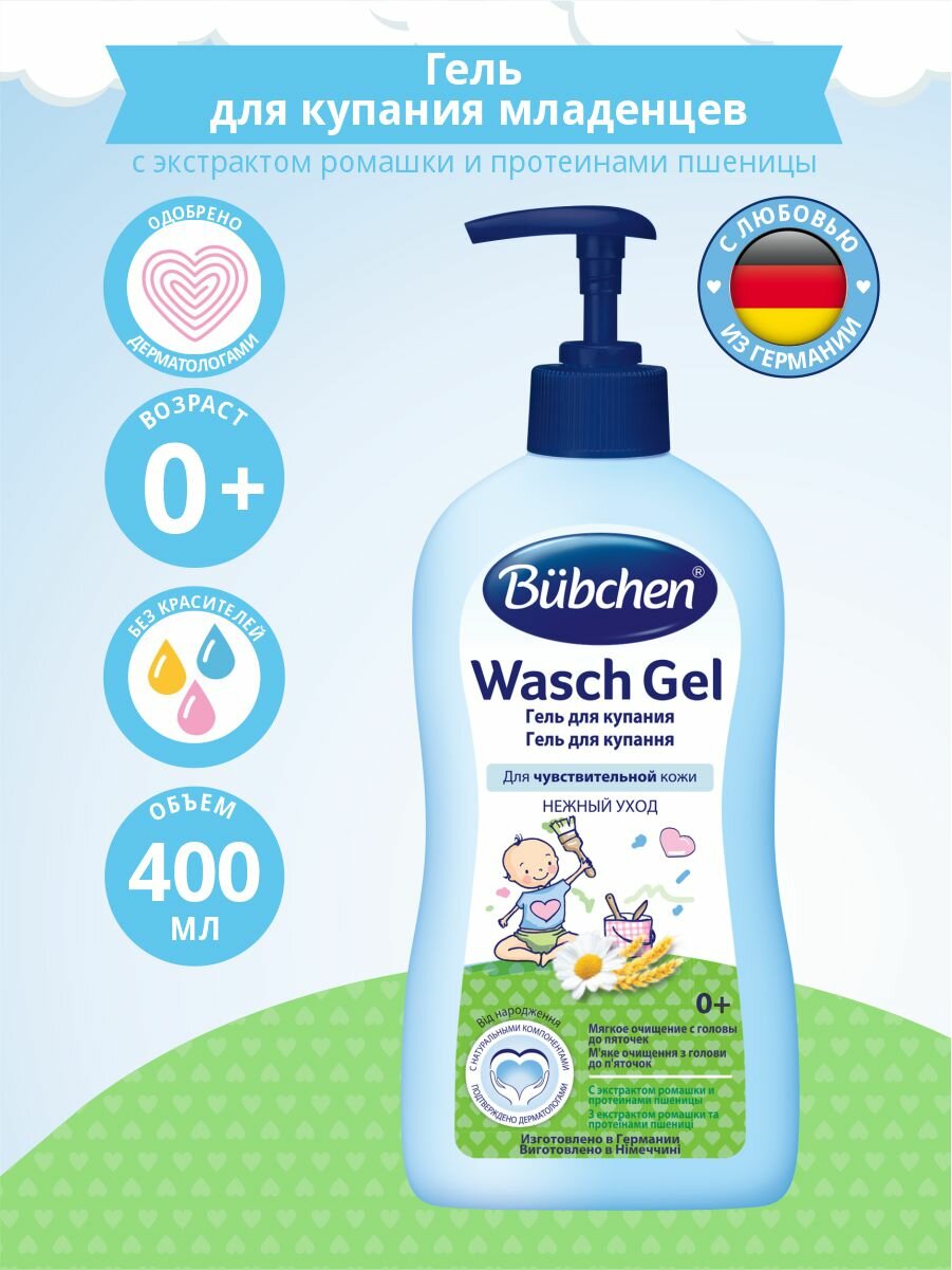 Детям с рождения. Детский гель для купания Bubchen с ромашкой 400 мл. Гель для купания Bubchenидеально подходит для ежедневного очищения чувствительной кожи и тонких волос. Он очень мягкий, нежнее, чем детское мыло, и поэтому идеально подходит для повседневного очищения тела, начиная с головы и заканчивая ступнями. Гель обеспечивает мягкое очищение и обогащает кожу и волосы ценными питательными компонентами. Экстракт ромашки обладает успокаивающими и ранозаживляющими свойствами. Сохраняет естественный защитный кислотно-липидный слой кожи. Не раздражает слизистую глаз. С удобным дозатором. Протеины пшеницы поддерживают естественную защитную функцию нежной детской кожи. Продукт разработан с целью минимизировать риск возникновения аллергии. Без вызывающих аллергическую реакцию ароматизаторов, pH-нейтрально для кожи. Переносимость кожей подтверждена дерматологами. С протеинами пшеницы. С натуральным экстрактом ромашки. С моющими компонентами растительного происхождения.pH-нейтрален. Не содержит мыла. Без красителей и консервантов. Проверено дерматологами. Подходит для детей с рождения и для всей семьи. Способ применения: Добавьте небольшое количество геля для купания в ванночку или нанесите на ладонь (губку), а затем легкими массирующими движениями на влажную кожу или волосы. Ополосните чистой теплой водой. Состав: Aqua, Sodium Laureth Sulfate, Cocamidopropyl Betaine, Glycerin, Disodium Laureth Sulfosuccinate, Panthenol, Polysorbate 20, Parfum, Chamomilla Recutita Extract, Citric Acid, Coco-Glucoside, Glyceryl Oleate, Heliotropine, Hydrogenated Palm Glycerides Citrate, Hydrolyzed Wheat Protein, PEG-120 Methyl Glucose Dioleate, Phenoxyethanol, Polyquaternium-10, Sodium Benzoate, Sodium Chloride, Sodium Citrate, Sodium Hydroxide, Tocopherol. Срок годности: 36 месяцев.