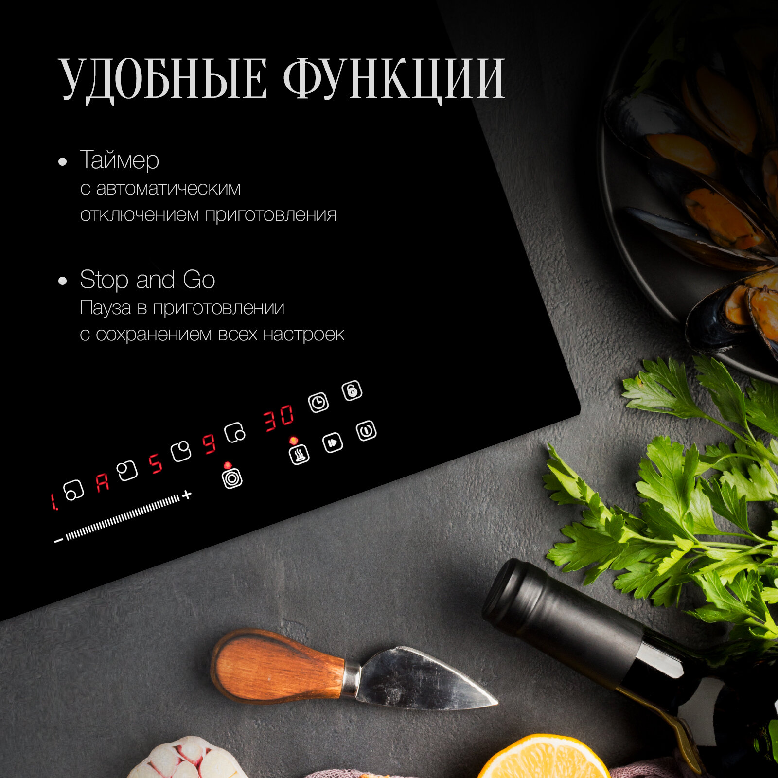 Варочная поверхность выполнена из надежных и добротных материалов, отличается простым уходом за ней, а также подходит для большинства интерьерных стилей. Панель управления, с помощью которой легко и удобно управлять изделием, надежна и интуитивно-понятна. Зона расширения позволяет вам использовать посуду разного размера и формы. Вы можете использовать длинную посуду как для готовки большего объема сразу, так и приготовления красивых блюд, например, рыбы целиком. Функция мгновенного отключения нагрева и такого же мгновенного возобновления работы. С этой функцией вы можете остановить процесс готовки, если вам нужно отойти, одним нажатием. После можно быть уверенным, что нагрев прекратился, и не опасаться того, что еда подгорит при вашем отсутствии. блокировка. Функция блокировки повышает безопасность использования варочной поверхности. Активировав блокировку, вы можете не бояться того, что дети изменят настройки или вы переключите мощность, случайно положив руку на панель управления.
